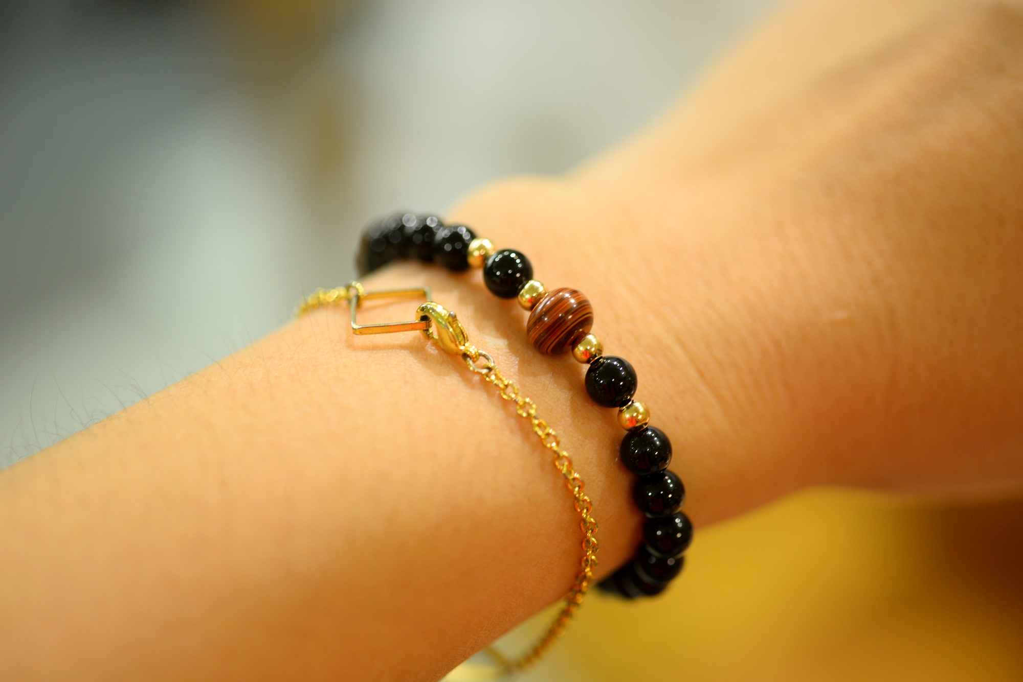 課程將準備不同樣式、顏色的漆石,學員可以自行設計手環。材料可任選漆石珠一顆、黑瑪瑙數顆、黃銅片等素材任意搭配。