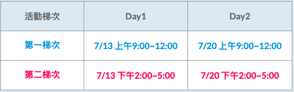第一梯次 07/13 上午9:00 ~ 12:00、7/20 上午9:00 ~ 12:00