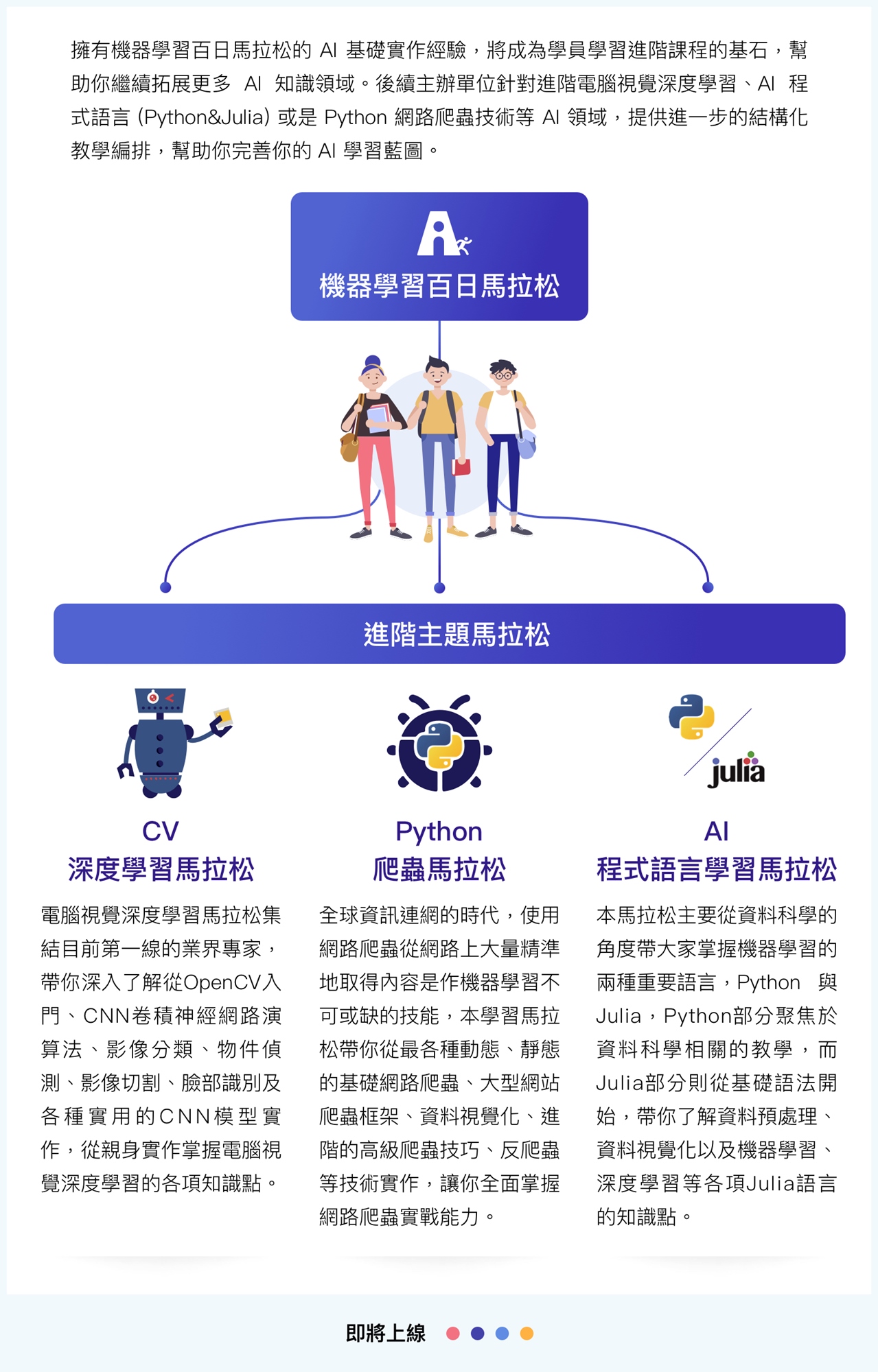 第一、二屆機器學習百日馬拉松,在活動開跑前半月即招募額滿,超過兩千位學員參與,上次沒有報名到的朋友,這次要把握機會提早報名。第三屆《機器學習百日馬拉松》將於八月底開跑,第三屆馬拉松除了有更多 AI 專家加入、原有教材再升級,提供更多延伸閱讀外,在每個主題結束前,都有專家的影片教學回顧,幫你更有系統掌握 AI 知識。