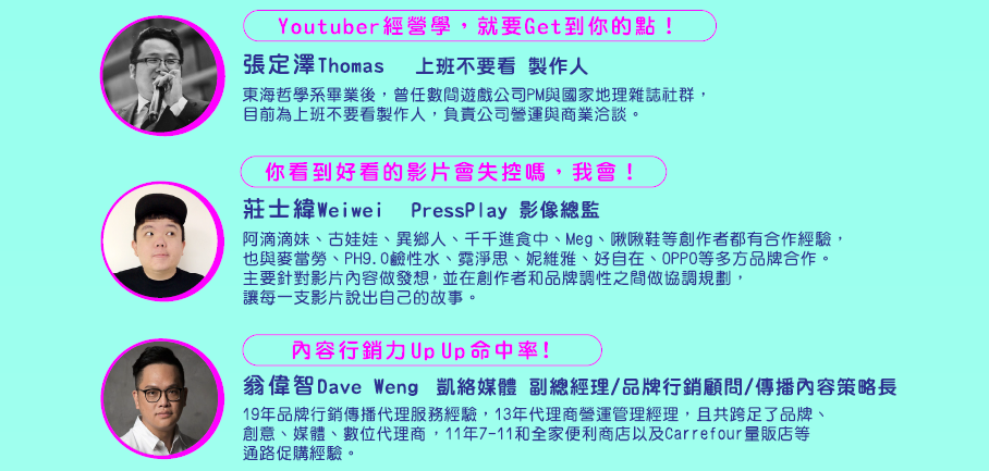 8/16 09:30-12:00 | Youtuber經營學,就要Get到你的點? 2. 企劃的發想考量與選擇 3. 目前youtuber的現況 4. 如何傳達商業案件的資訊 5. 如何選擇案件與溝通方式 6. 如何經營觀眾忠誠 | 上班不要看製作人 張定澤 |