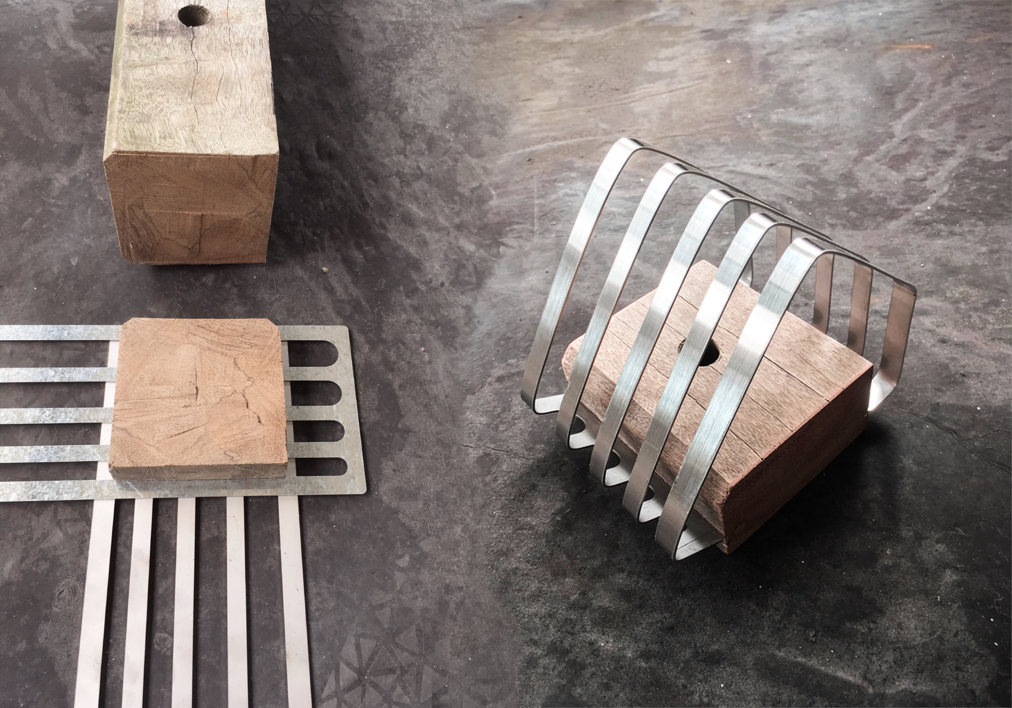 與木橫擔的異材質結合不同的特性與紋路,展現鐵的百種面貌。