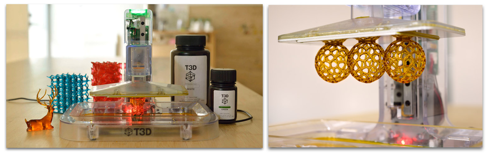 來自於台灣科技大學spin-off的台科三維科技(T3D),是由台科大機械工程系鄭正元教授領軍成立的新創公司,該團隊致力於提供創新的3D列印整體解決方案,花了 5 年時間的研發將光固化3D列印的整體門檻降至最低,其推出的T3D列印機為目前市場上最小台、最具有價格優勢的行動3D列印機,透過專屬App、鏈結雲端圖庫,即可利用手機或平板進行3D列印。