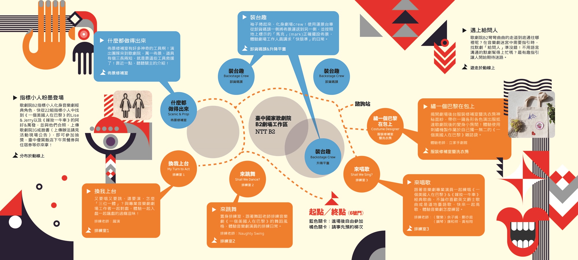 遇上給問人 Ask Me | B2 | 歌劇院B2彎彎曲曲的走道到底通往哪裡呢?在音樂劇迷宮中需要指引時,找默劇「給問人」準沒錯!不用語言溝通的默劇幫得上忙嗎?最有趣指引讓人開始期待迷路。 | 自由參加 |