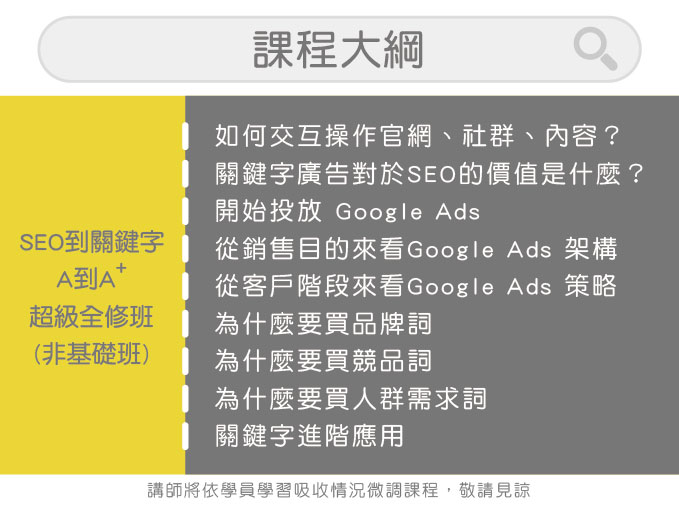 內容貫穿 SEO 搜尋引擎優化、Google Ads 投放與優化,獨到的經營策略與步驟,照表操課就可以看到成效! 搶先分享三個課中心法:
