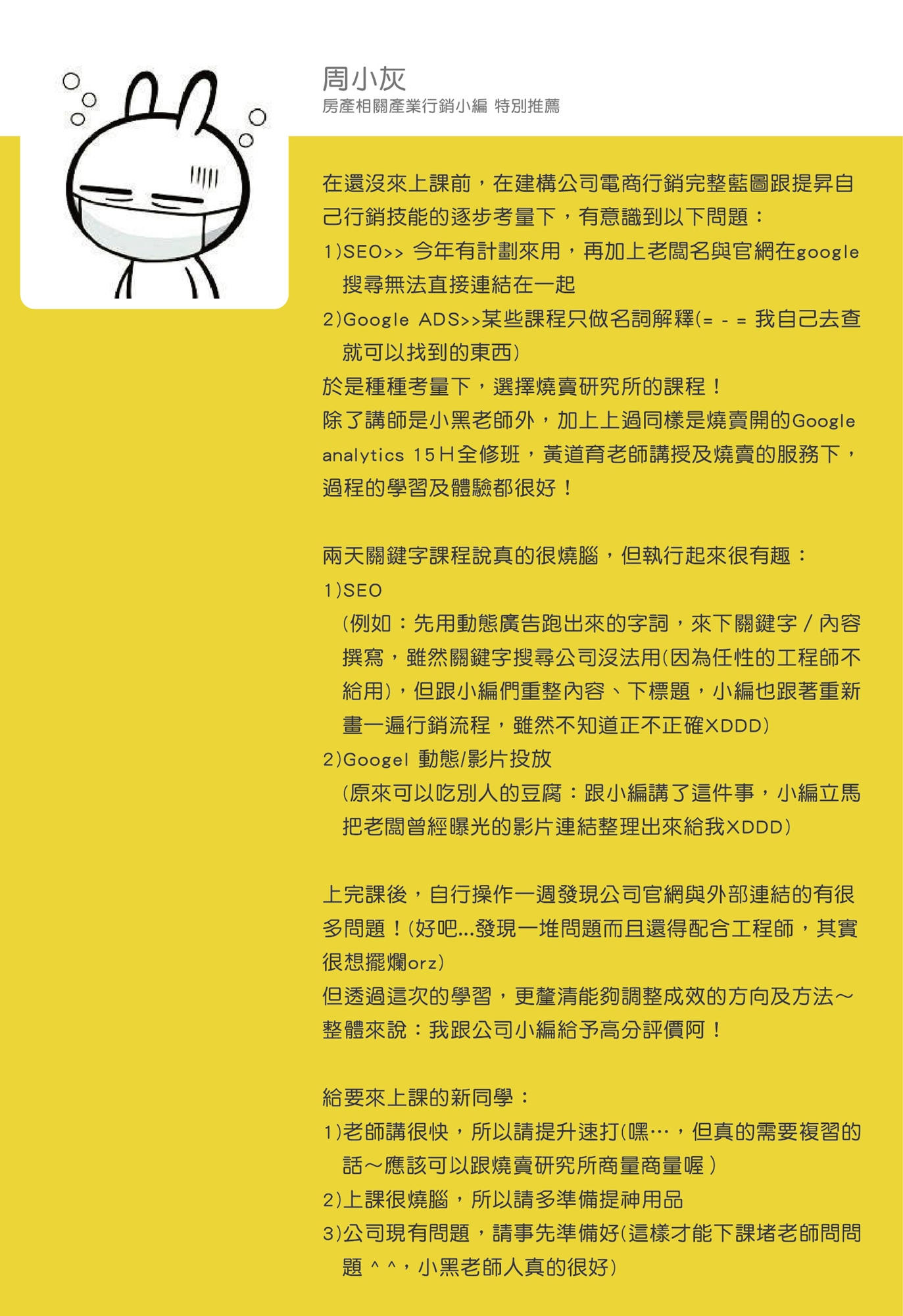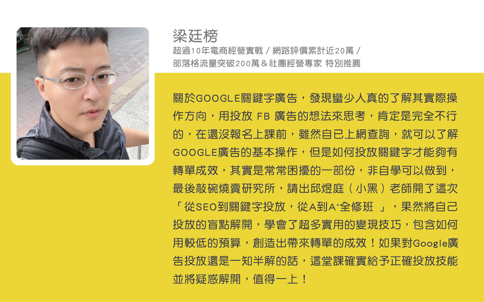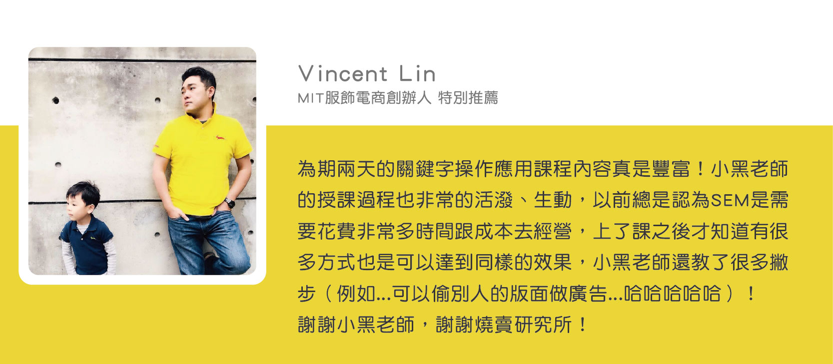 身為資深行銷 燒賣有主題性學習,針對數位行銷最需要加強技術操作的議題,開設實體課程,您自學無法解決的疑惑,讓講師一次幫您搞定。