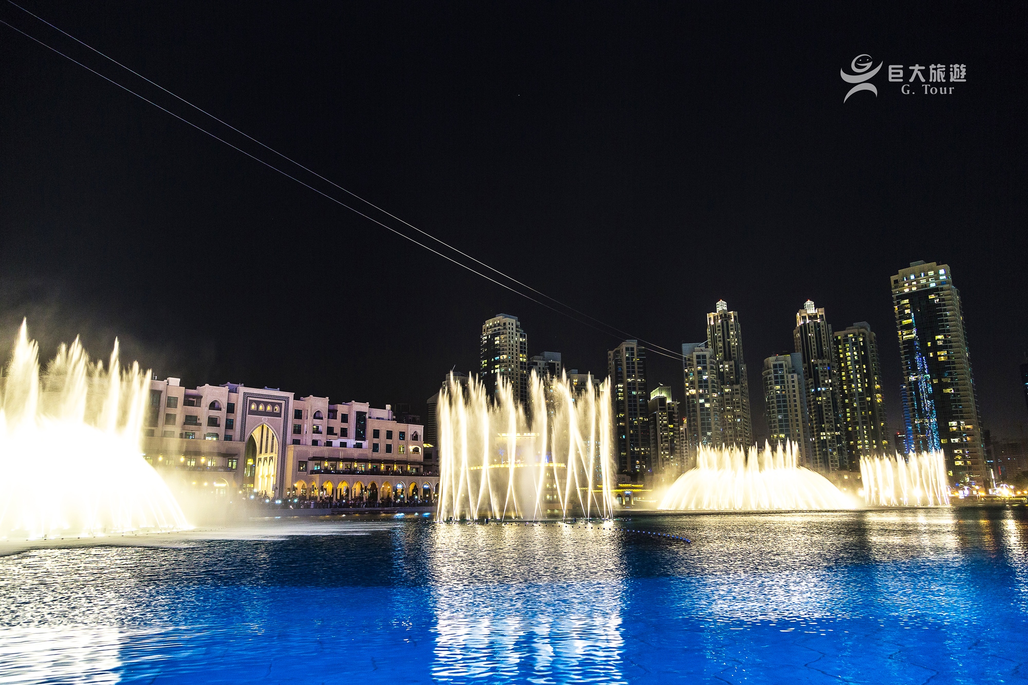 杜拜音樂噴泉~全球最大的音樂噴泉表演;每一段表演都搭配不同的歌曲伴奏,跟隨音樂配上五光十色的燈光效果,水花舞動出不同凡響的音樂饗宴。