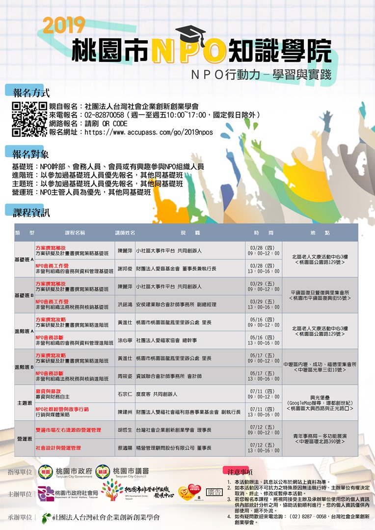 「108年桃園市NPO知識學院:NPO行動力-學習與實踐」05/17-07/12:原報名連結已關閉(席位已滿),請在此報名即可。