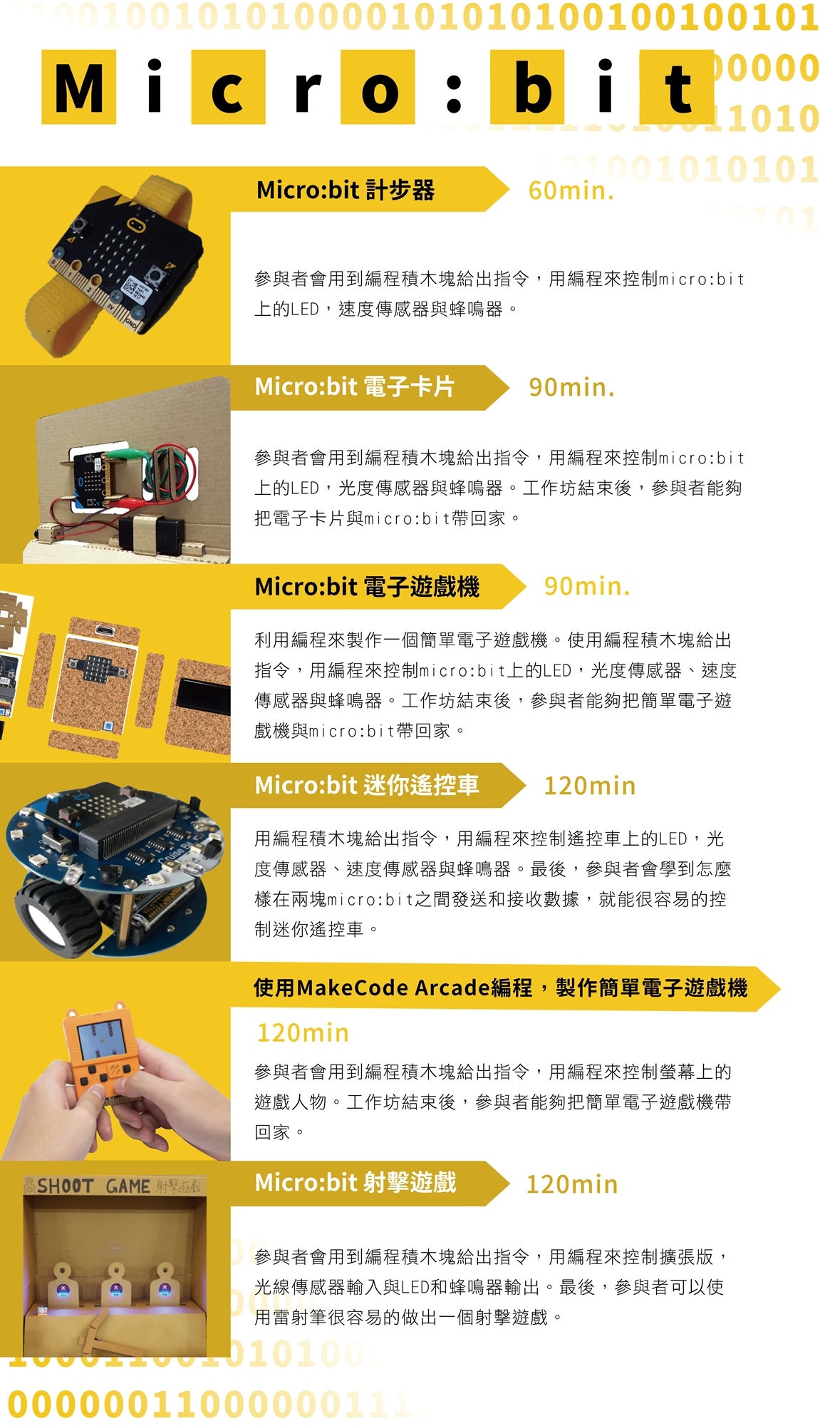 工作坊將會使用英國廣播公司BBC,專為兒童所設計的micro:bit微型電腦,帶領學員用程式開發控制簡易的電子裝置,如計步器、遙控車、遊戲機、射擊遊戲等六種不同應用,激發兒童對新奇事物的好奇心!!