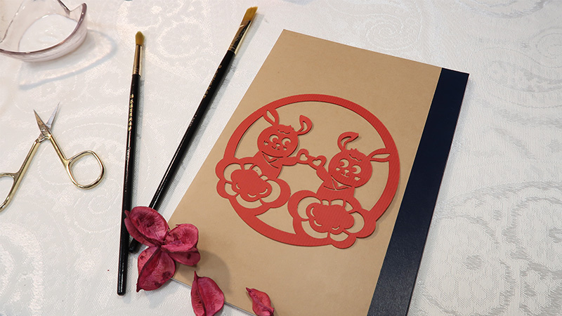 用水裱技法或使用噴膠將剪紙糊上書封,做出屬於自己的個人記事本。