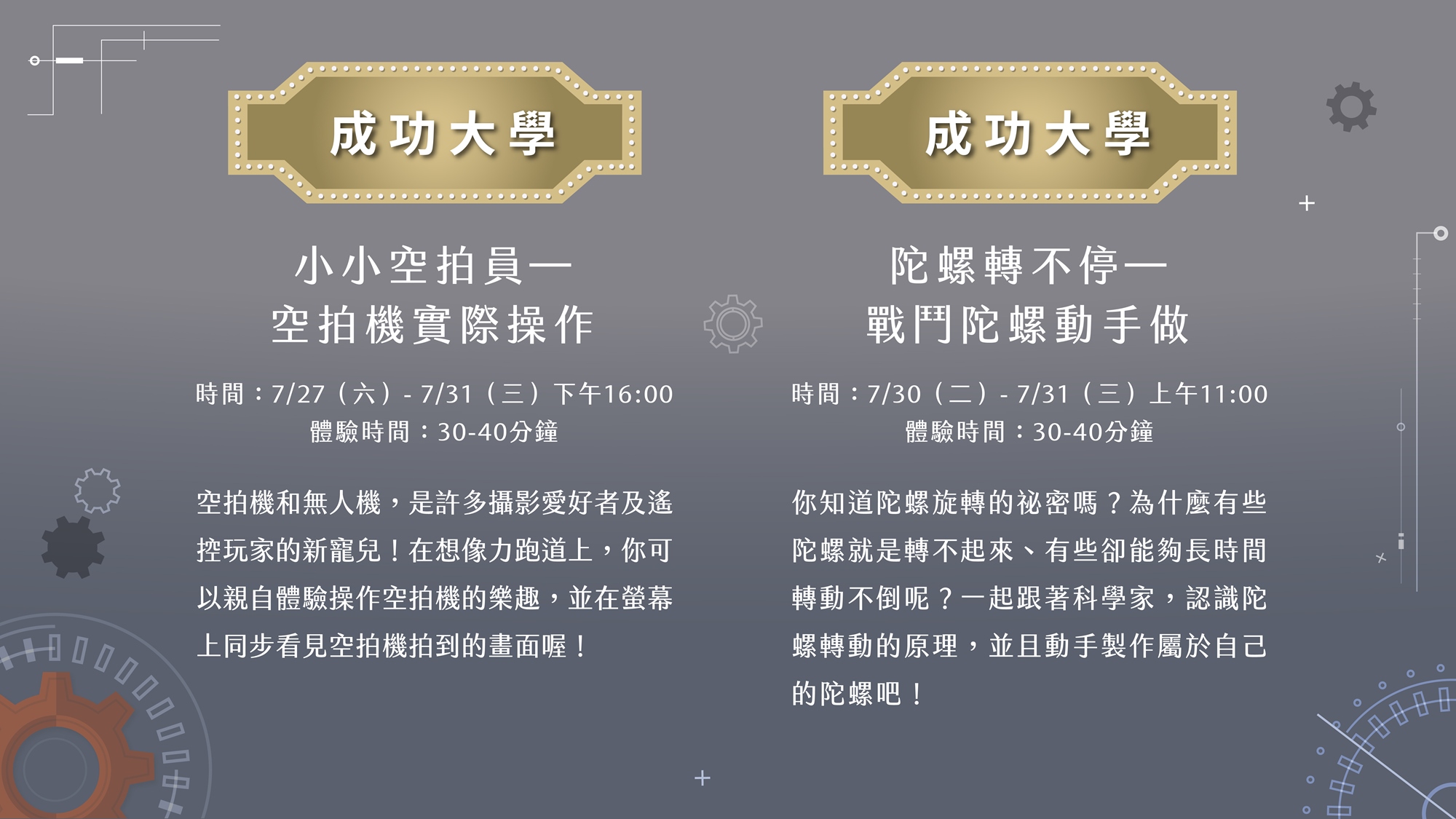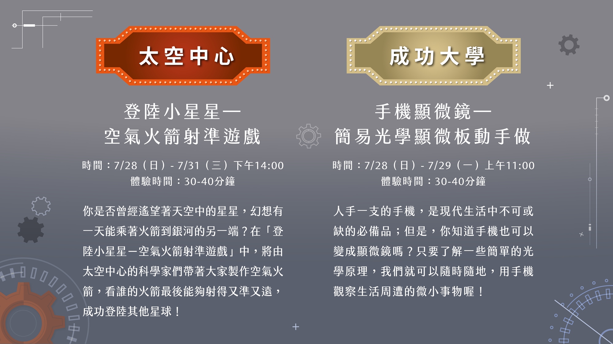 成功大學的科學家們使出拿手絕活,要給你最酷的科學體驗!不論是物理科學家們的陀螺戰鬥、光電科學家讓光線轉彎,以及最神秘的科學密室,想要大膽玩科學的你,科學樂園永遠不缺樂趣!
