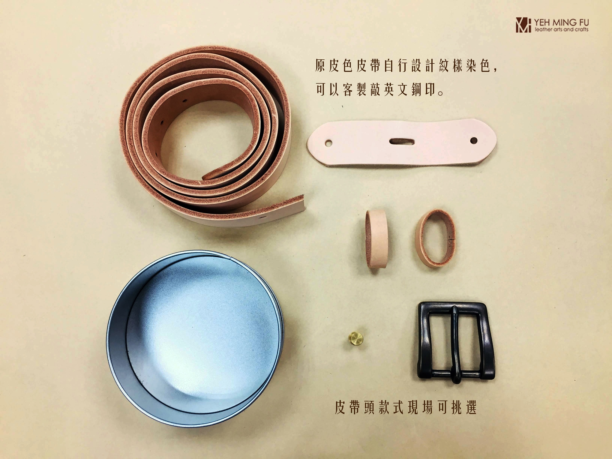 課程內容為完成一條皮帶(包含染色、敲印、裝釘)
