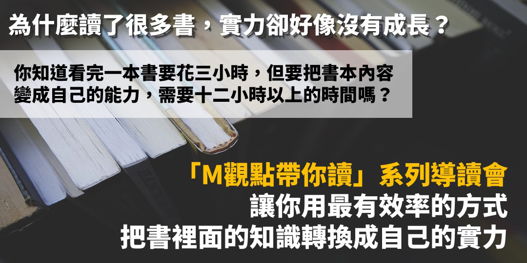 「M觀點帶你讀」是一個高效率的讀書學習管道,透過「M觀點商學院」創辦人 Miula 系統性的提取書中核心價值,並以第三方觀點分享如何將書中能力實際應用。聆聽60分鐘的講座,你就能掌握書籍作者所要傳授的能力,輕鬆省下三倍以上時間!