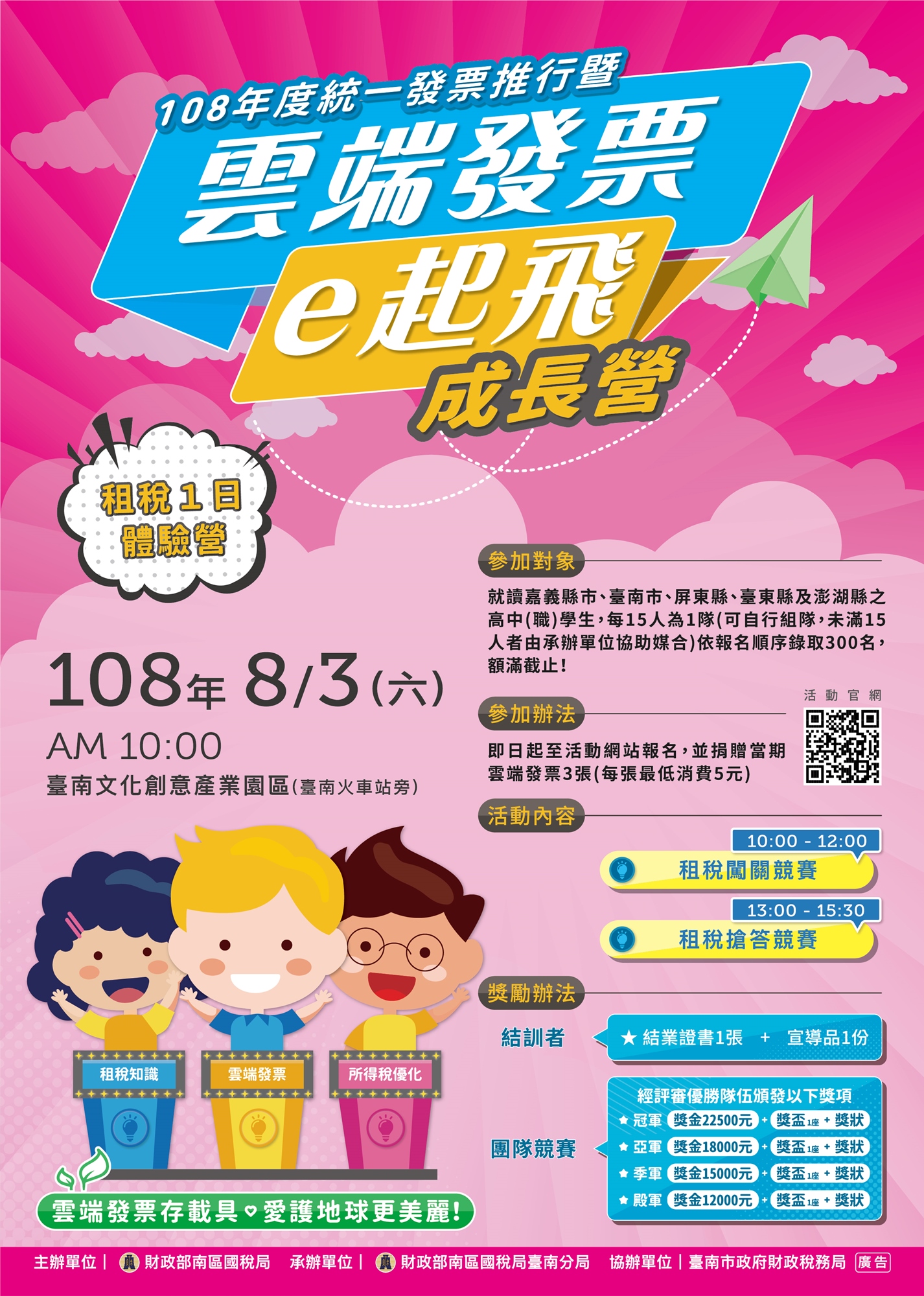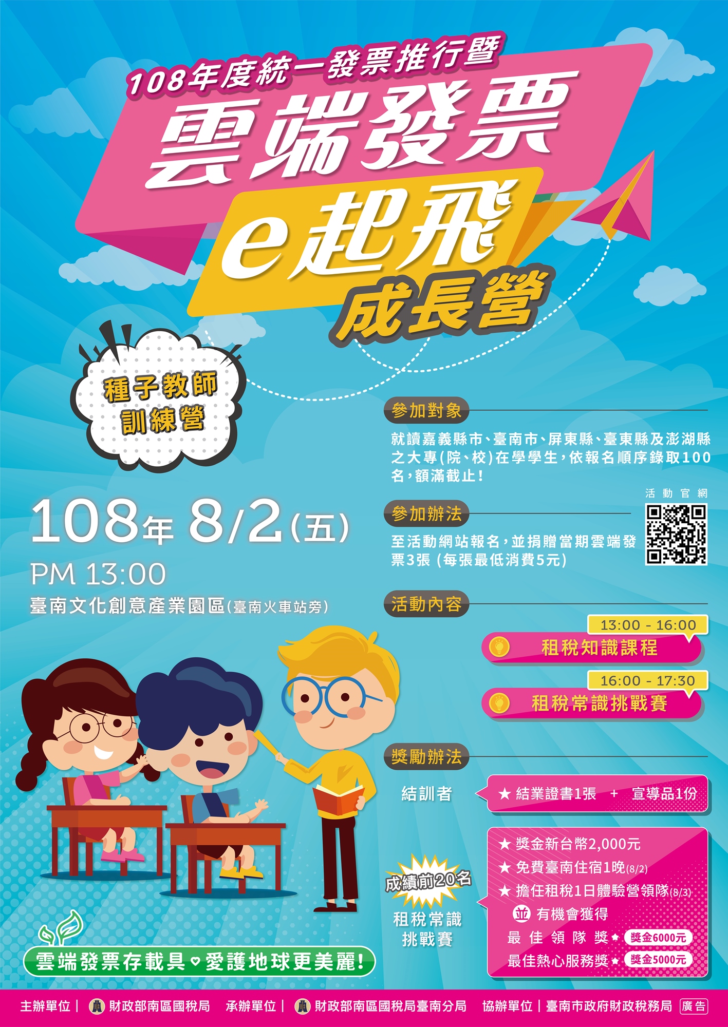 為落實租稅教育向下紮根,財政部南區國稅局臺南分局於暑假期間特別規劃適合大學生的「種子教師訓練營」及高中(職)學生的「租稅一日體驗營」活動,讓青年學子透過闖關遊戲、租稅知識搶答競賽等活動,建立正確的租稅觀念、體認租稅與生活的重要性,並認識雲端發票在生活中的應用,歡迎青年學子加入我們的行列,充實暑假生活共度知性的歡樂時光!
