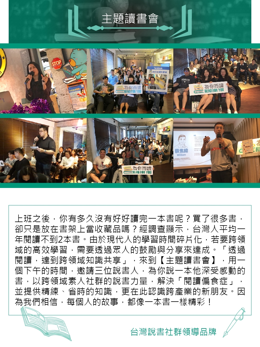 【為你而讀】成立近三年來,舉辦超過300場的閱讀相關活動,共計10,000人次以上參與,粉絲團累積人數超過20,000 人,國內和國際策略合作夥伴超越100家,並於2018年底邁入讀書會第100會。我們邀請各產業菁英、素人擔任說書人,結合產業經驗為你說書,一年介紹超過一百本書,讓你結交一千位不同產業的新朋友,是台灣線下說書社群的領導品牌!