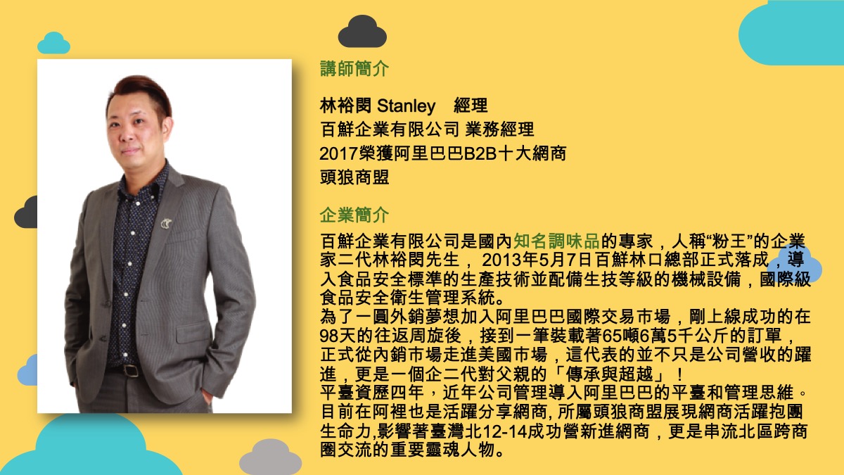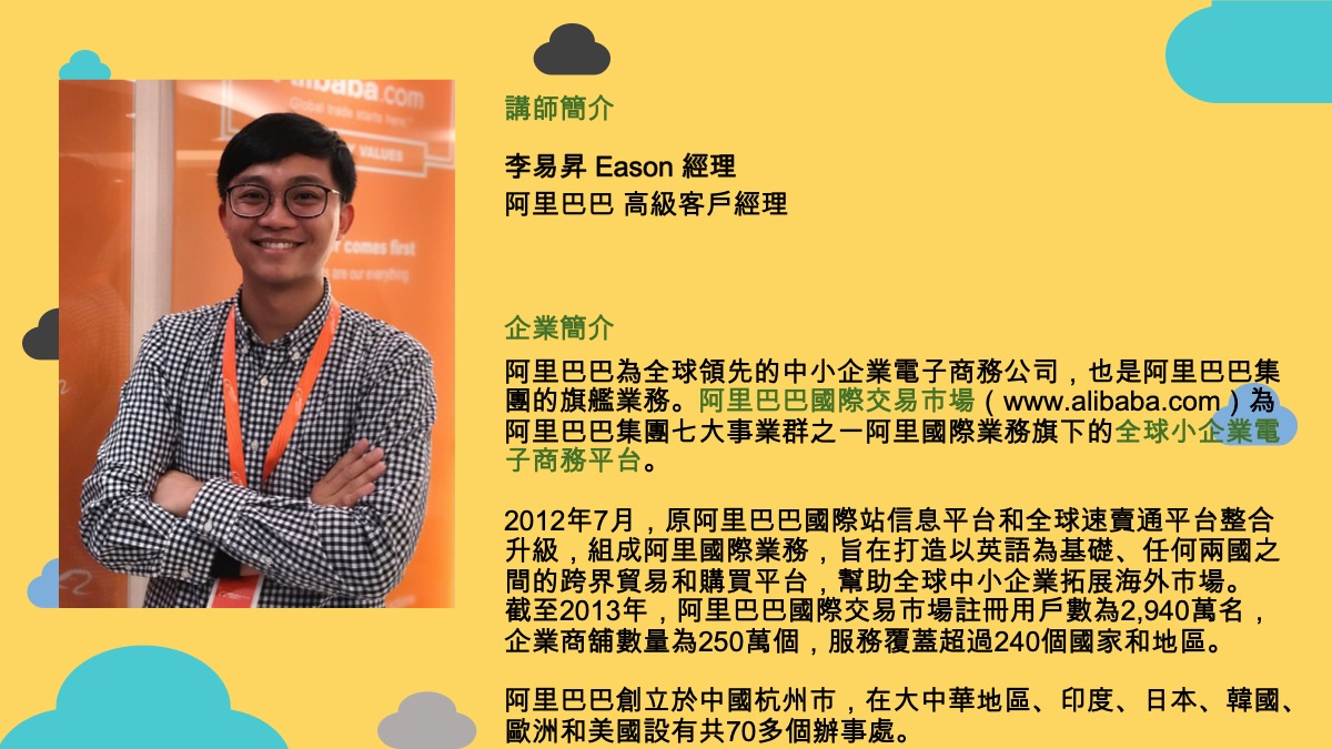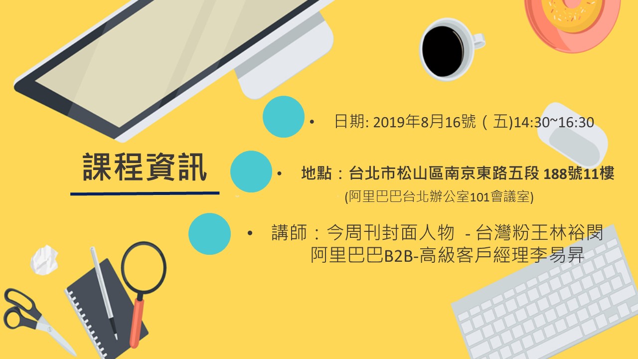 感謝阿里巴巴國際站與台灣粉王的協助與高效率,講座時間將延至 8/16(五)。時間/地點維持不變。請已報名的朋友,注意相關訊息。