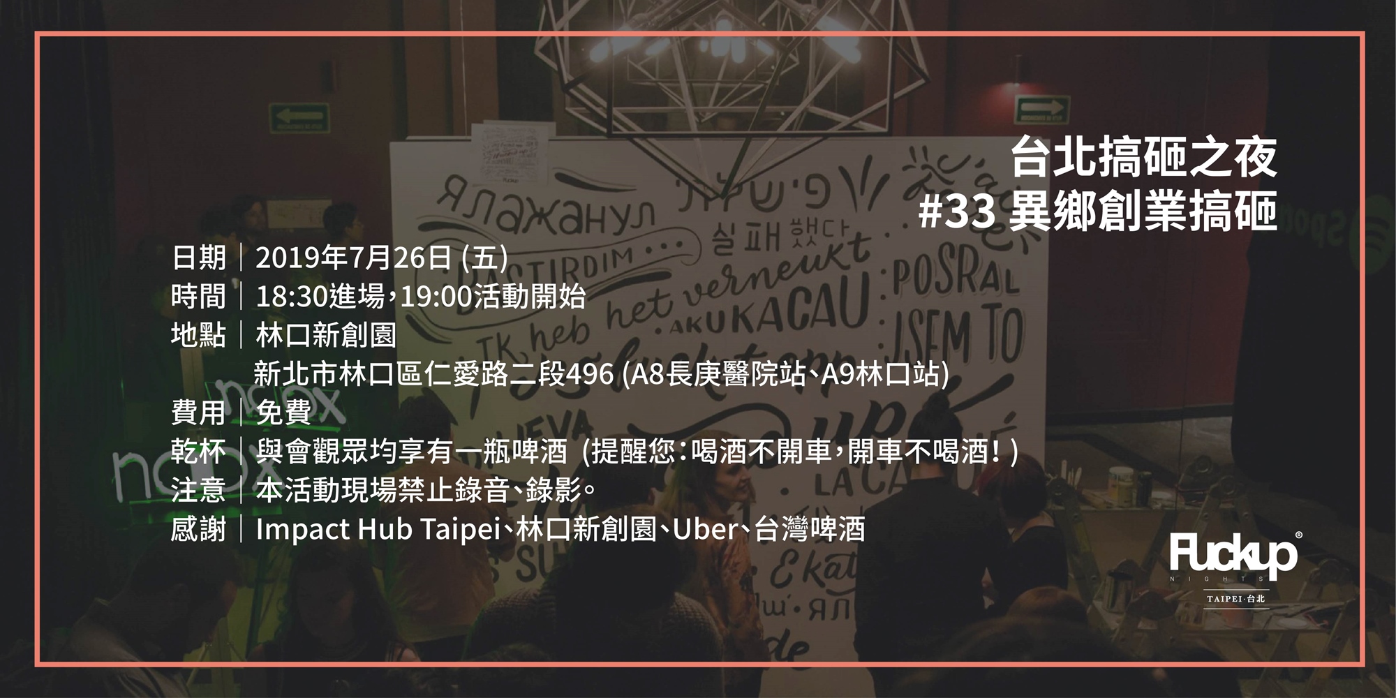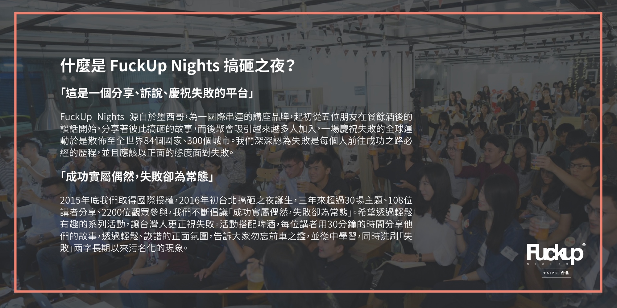 FuckUp Nights / 搞砸之夜,2012年起源於墨西哥,是個國際串連的講座品牌,是個分享、訴說與慶祝失敗的平台,我們認為「成功實屬偶然,失敗卻為常態」,活動進行中搭配啤酒,透過正面、詼諧的方式,告訴大家勿忘前車之鑑,並從中學習,同時洗刷「失敗」兩字長期以來污名化的現象。