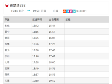 若從西部前往花蓮,建議去程搭乘普悠瑪282(台中15:57-花蓮19:50 車行約4小時)