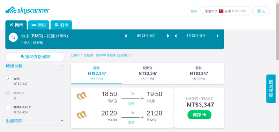 華信航空去程 台中18:50-19:50花蓮,回程花蓮20:20-台中21:20