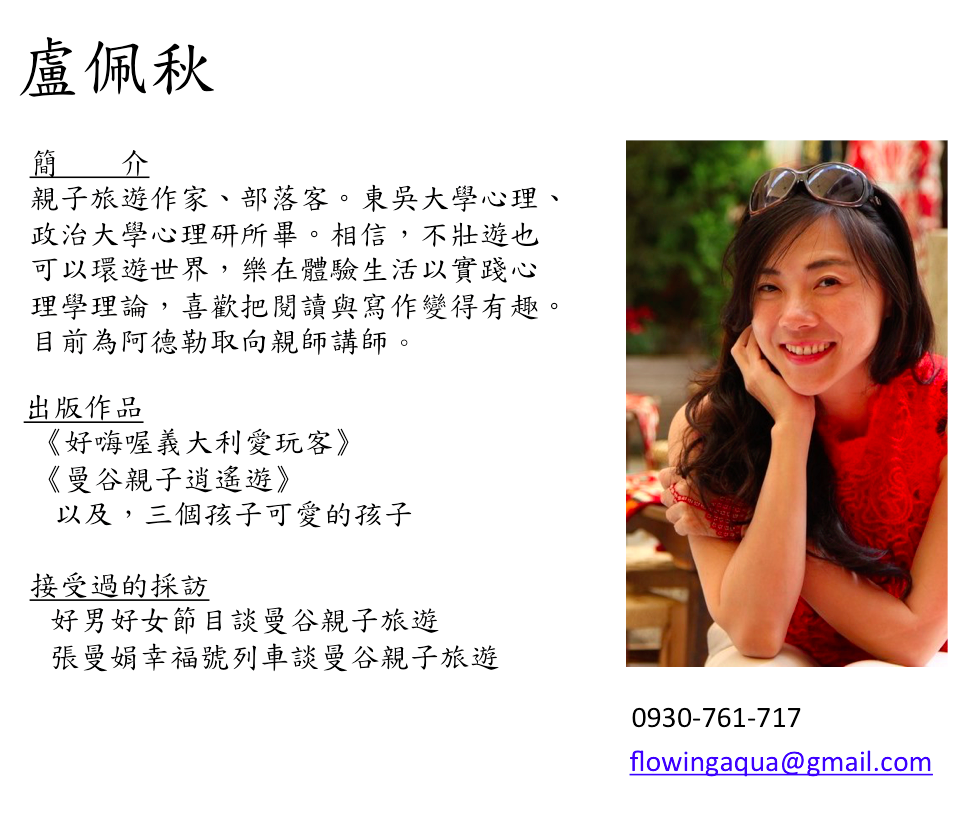 - 14:00~15:00 盧佩秋 《勇闖曼谷之”快樂"親子遊超EASY!》