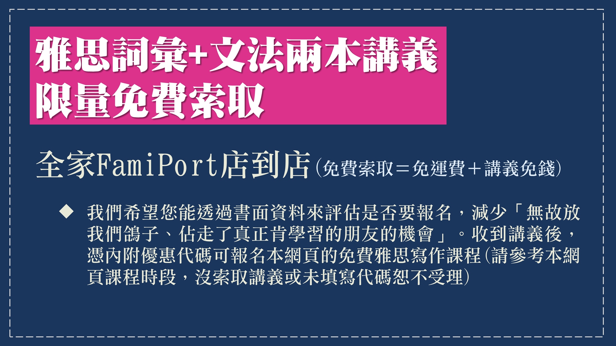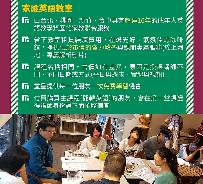 家維英語教室 已通過本平台審核身份與銀行資料成為金星級主辦單位 索取網址按此 (兩本講義:雅思詞彙+雅思文法)報名時請留意:有開放的時段才會顯示被預定、報名成功、過期的時段會隱藏茲以收據照片證實確實寄出