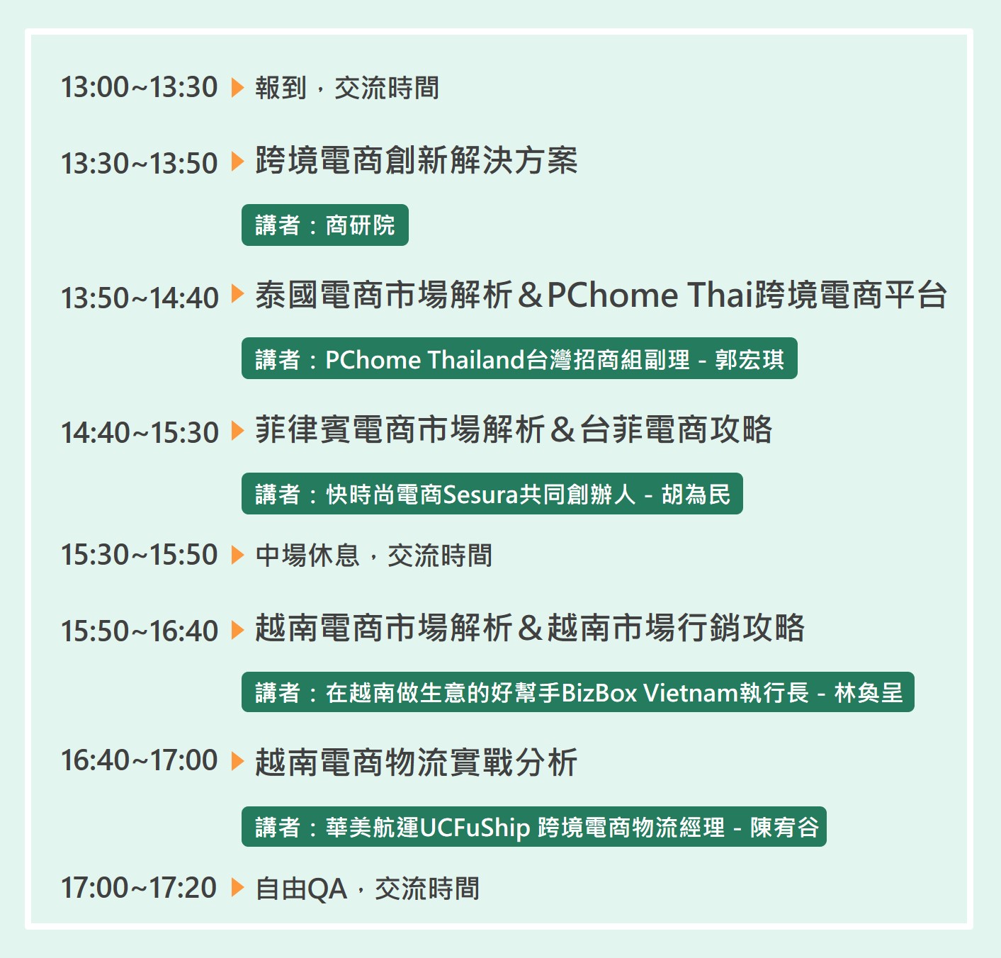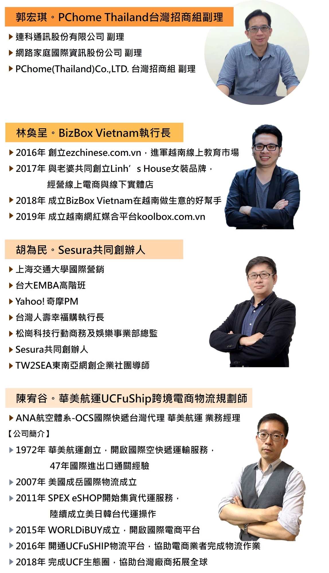 本次由商研院×台槓舉辦的【跨進東南亞!搶攻泰菲越 跨境電商實戰分享會】,邀請到四位在東南亞跨境電商領域耕耘,具有多年實戰經歷的業界講師南下高雄,PChome Thailand泰國電商平台副理-郭宏琪、越南跨境電商加速器BizBox Vietnam執行長-林奐呈、菲律賓快時尚電商Sesura共同創辦人-胡為民、華美航運UCFuShip跨境電商物流規劃師-陳宥谷,為我們一一解析泰國、菲律賓、越南、三大快速發展中電商市場的商機與挑戰,更將與我們分享最實戰、最接地氣的進軍跨國電商市場攻略與經驗,帶我們了解市場現況,跨進東南亞!