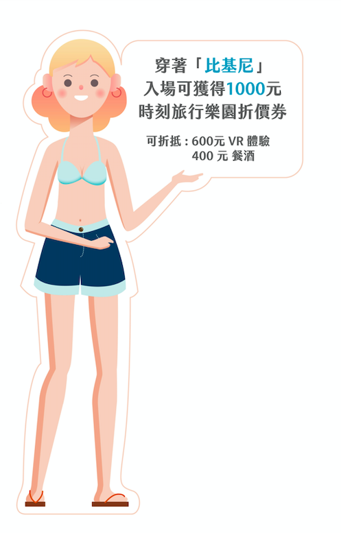 1. 「前30位女性」上半身著比基尼入場 ,可免費入場,並獲得1000元折抵券