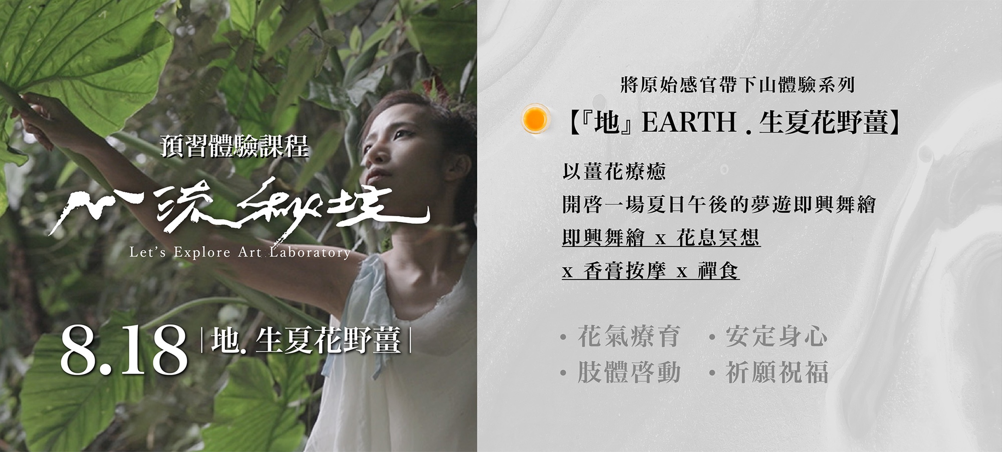全日的藝術饗宴中,我們將藝術體驗融入生活中的每一個環節,以即興舞蹈、繪畫、冥想、採集、禪食、按摩、祈福,喚醒身體感官記憶,啟動內在心流。每吋肌膚的接觸,霎那間感官的訊息傳遞、身體原始的記憶、一呼一吸、一動一靜,都是通往自「心」的秘境。