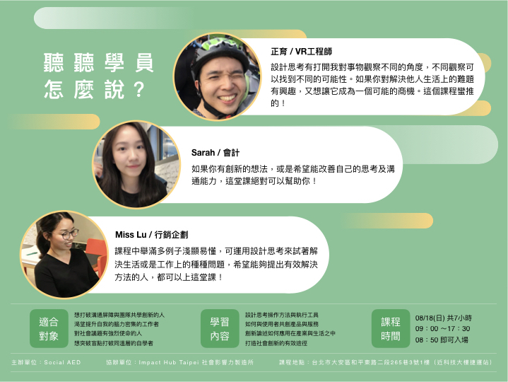 什麼是社會設計呢?在我們的見解中,為創造正面社會影響力而付諸的一切行動,不管是硬體、軟體、服務、甚至是商業模式,都是一種社會設計,而設計思考便是將其實踐的有效方法之一。如果你需要做出改變、如果你的團隊需要成長、如果你想了解如何開始創新,這堂課將能帶給你全新的視野!