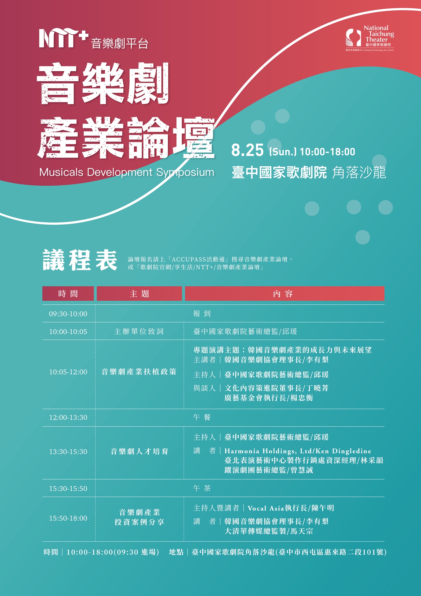 參加對象:表演藝術產業工作者、國內藝文場館、政府機關相關業務人員、藝文投資者與企