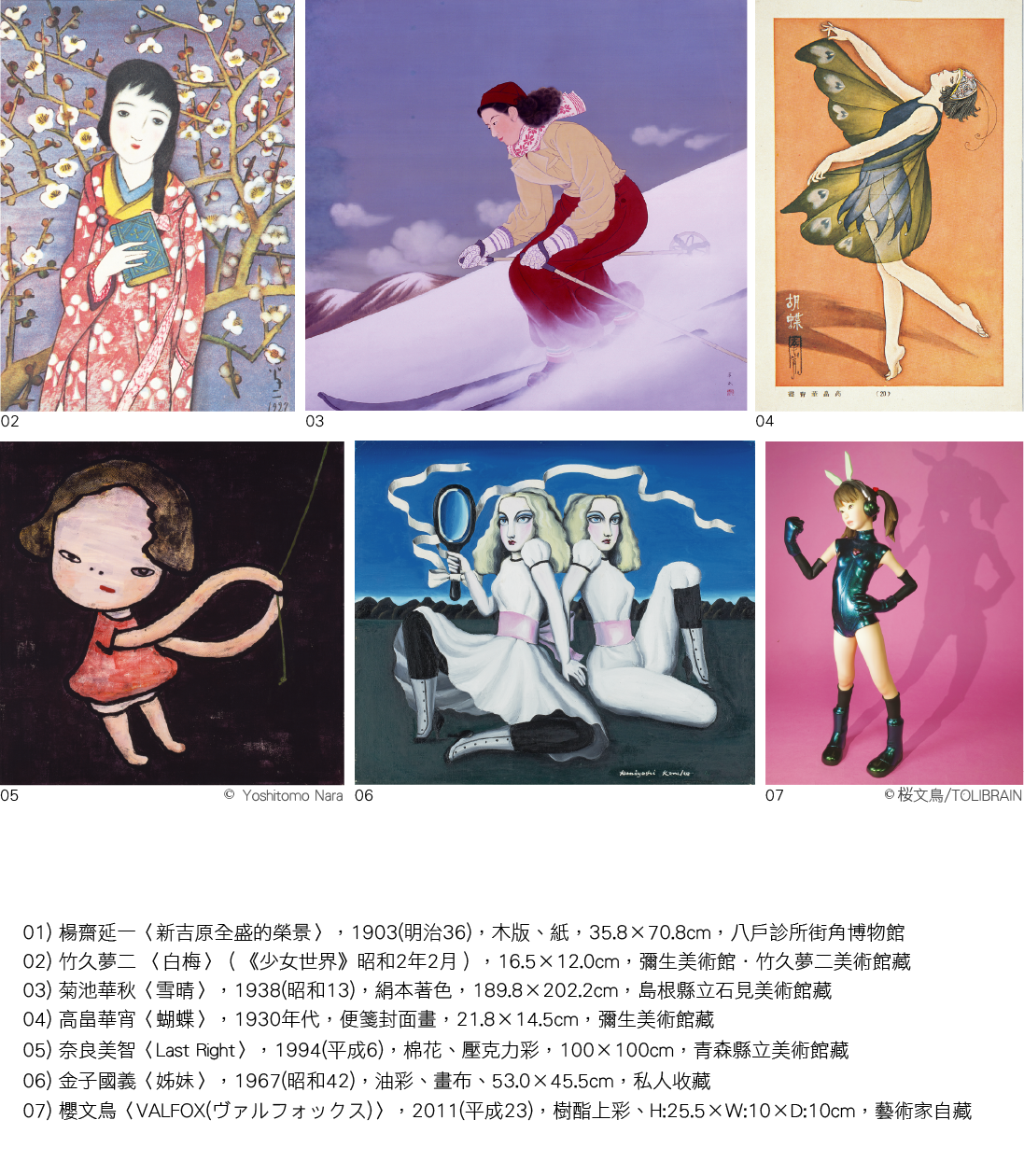 本次展覽自圖像文化研究為起點,爬梳生活史與審美價值發展,展出鈴木春信、鏑木清方、奈良美智、手塚治虫、丸尾末廣……超過六十多位名家之作,透過潮流最前線的動漫人物作為形象符碼,了解當前流動於產業與科技變遷的「少女」形象,帶領人們發覺流行文化與傳統藝術的承襲及表裡關係。