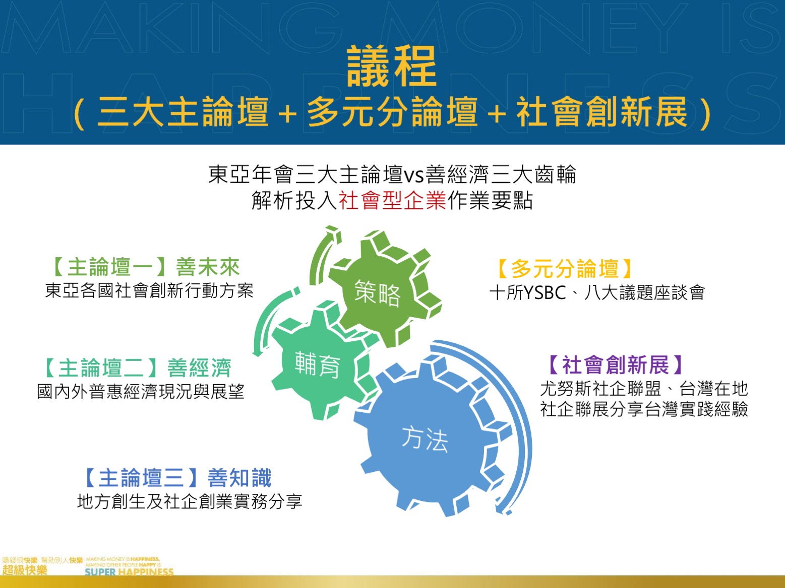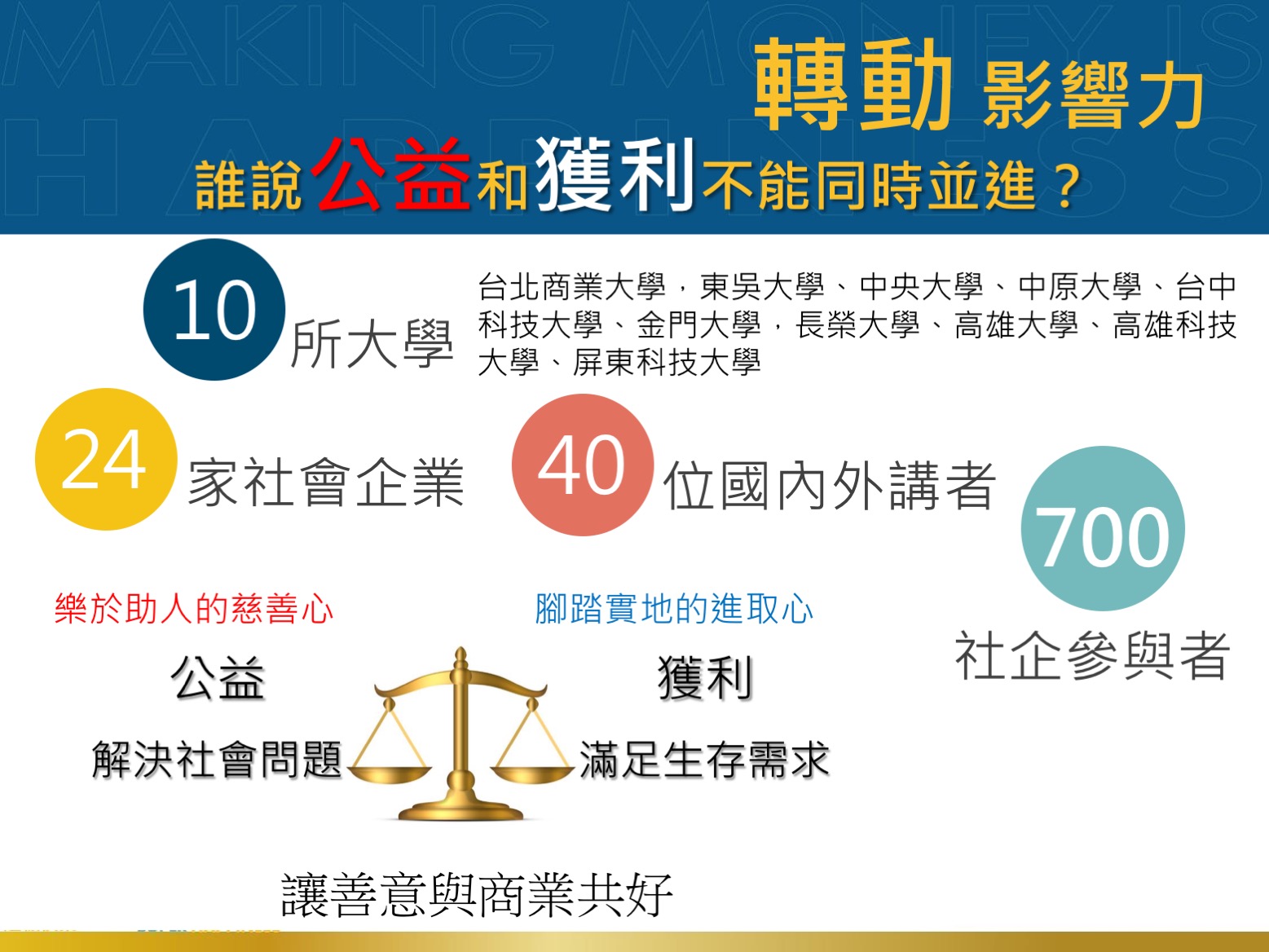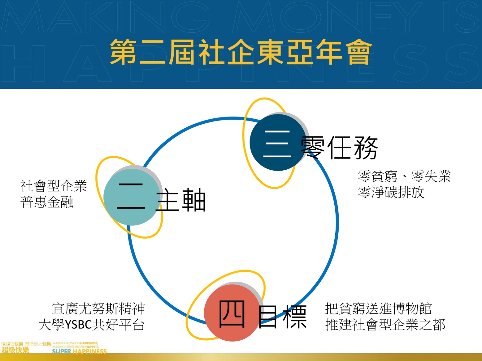 尤努斯博士長期推動格萊珉微型信貸與社會型企業,至今已幫助1億8000萬人脫貧,近年推動的社會型企業更擴至解決貧窮以外之各種社會問題,聯合國秘書長更公開表示:尤努斯博士的社會型企業模式有助於實踐17項永續發展目標SDGs,尤其在消除貧窮與消除飢餓的貢獻。尤努斯博士認為:「經濟學被歸類為社會科學,但是傳統經濟學的研究只關注於財富,忽視人文價值及社會效益」,如今「社會型企業」的概念重新將社會性的人文關懷加入經濟學,重啟社會科學的本質,而本年會更是沿用今年社會型企業世界年會主題「Making Money is Happiness; Making Other People Happy is Super Happiness.」,「賺錢很快樂,幫助別人快樂﹔超級快樂」所傳達的理念。