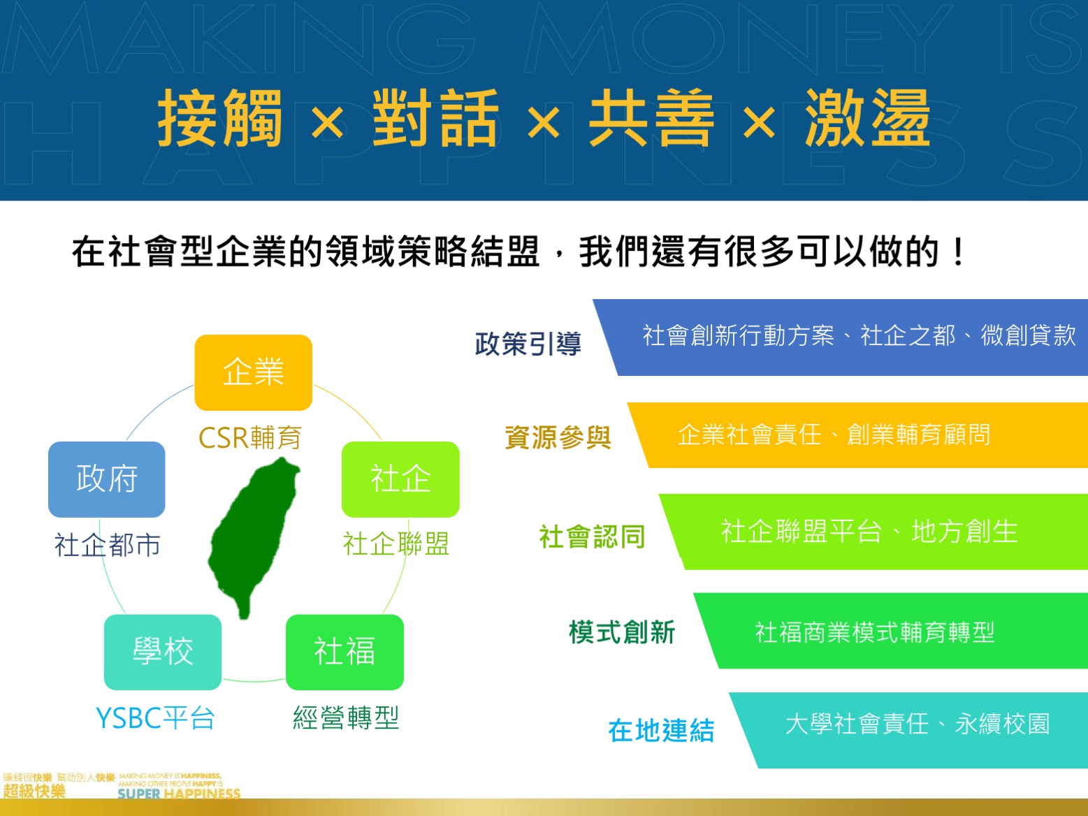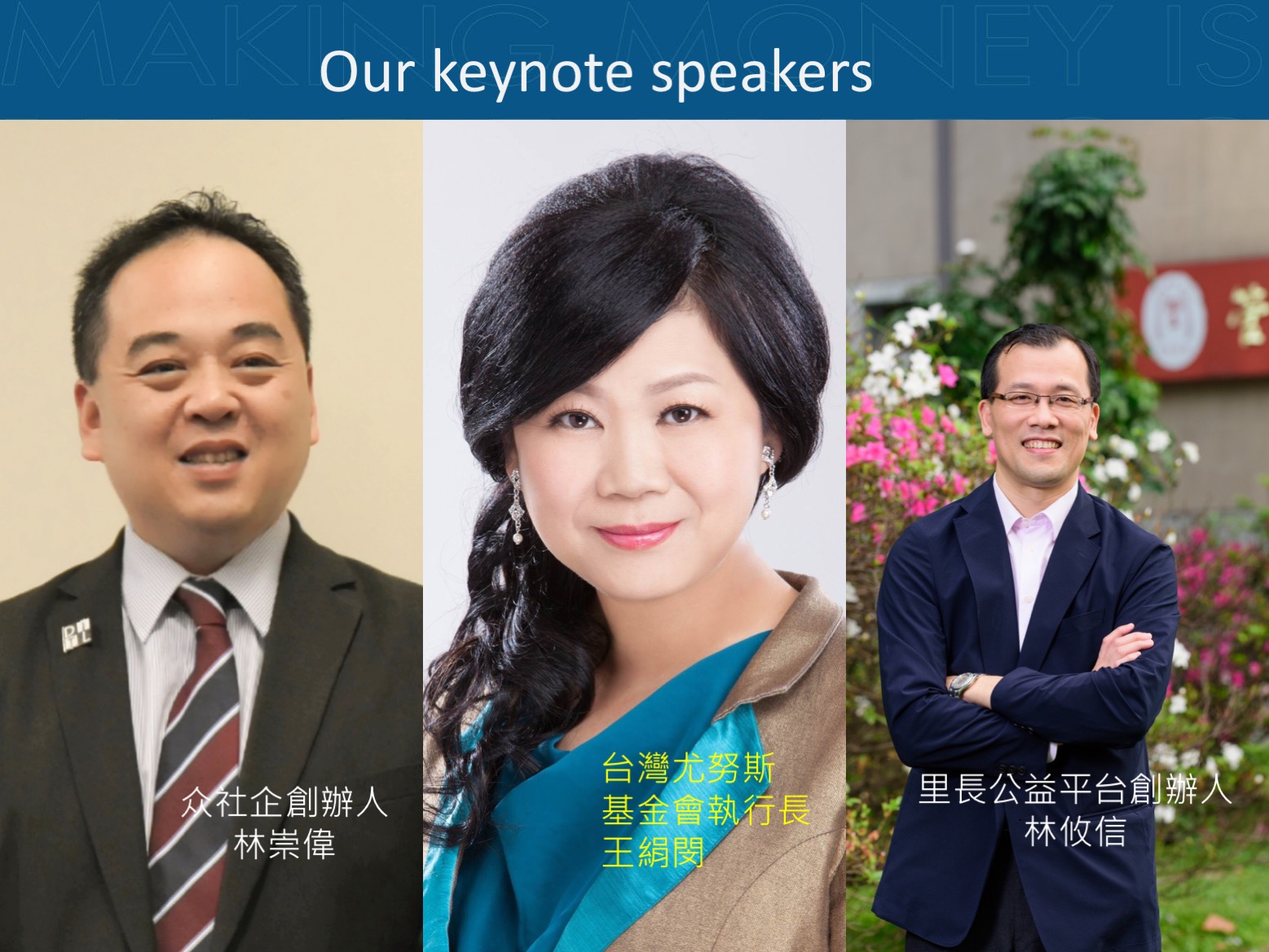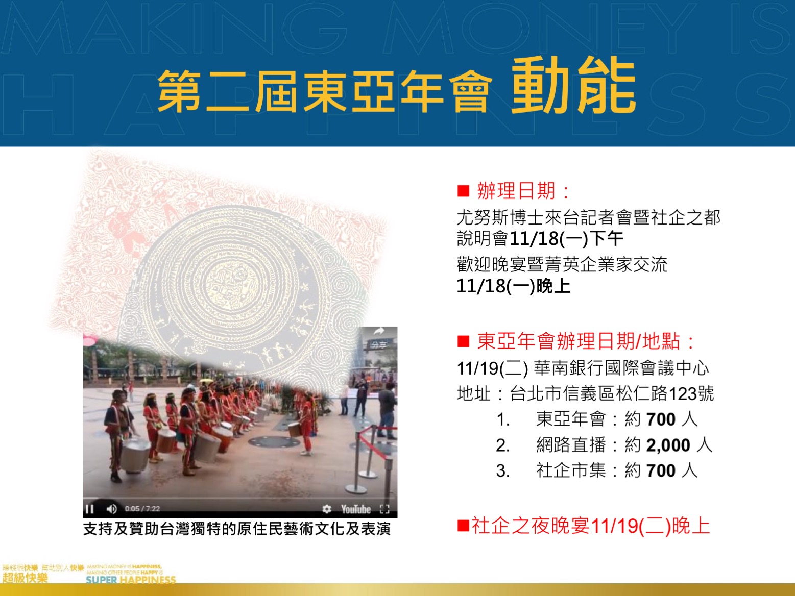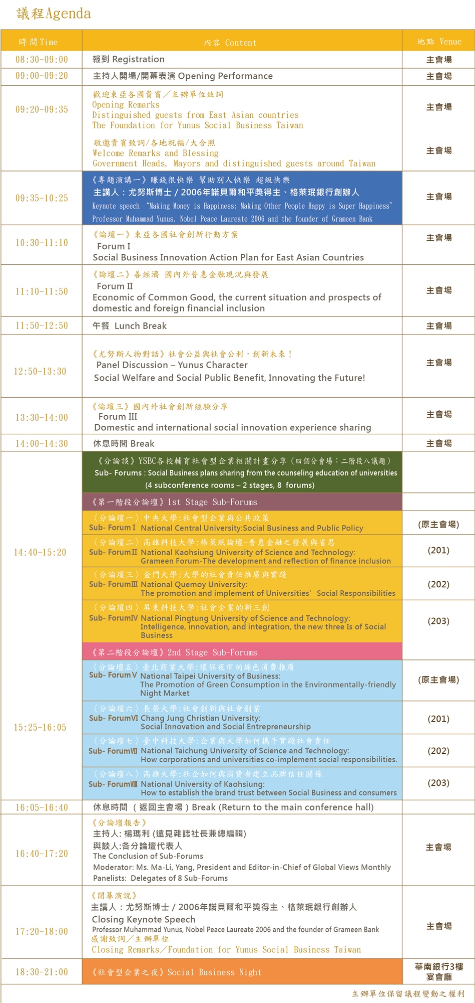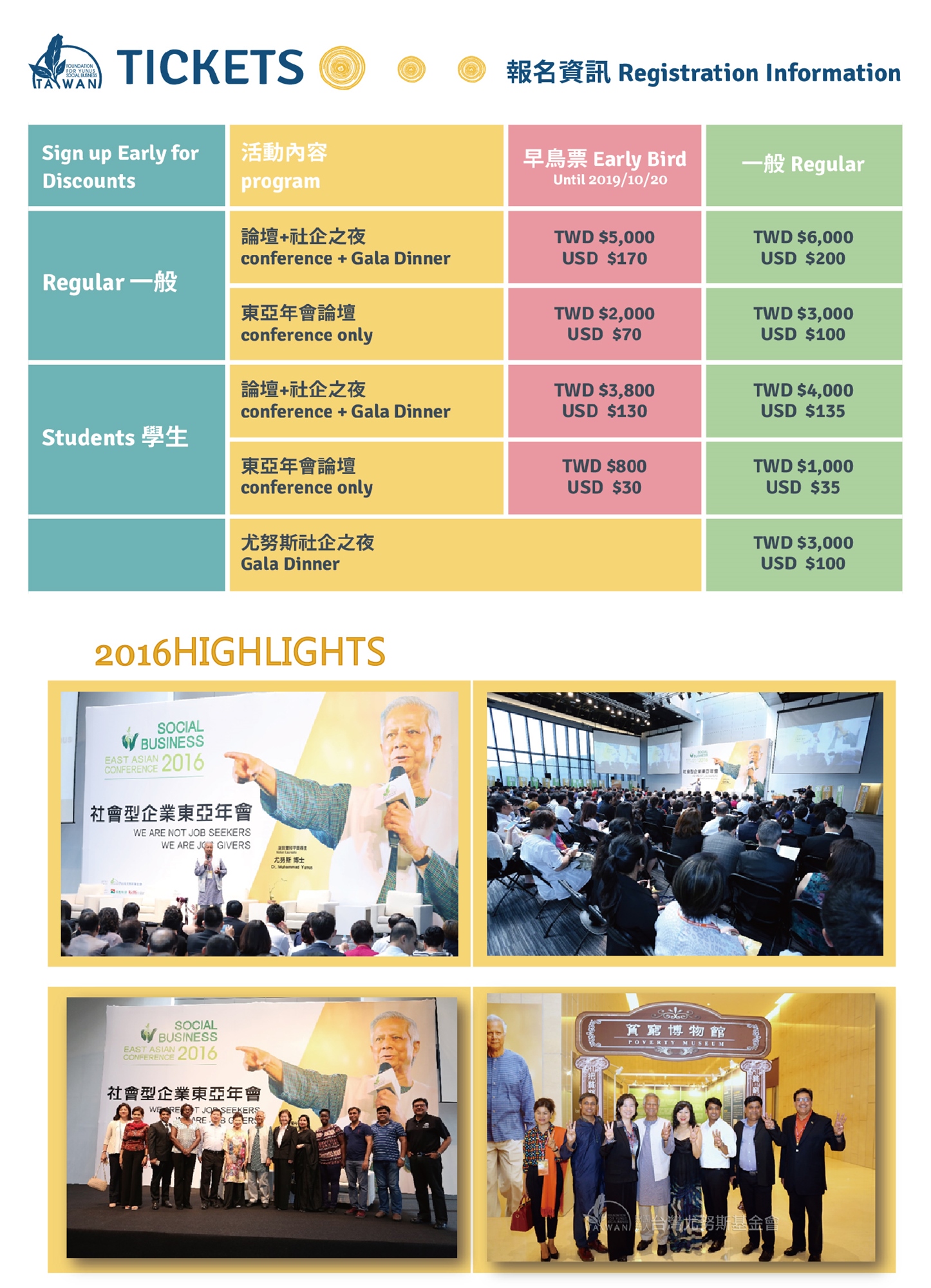 台灣尤努斯基金會成立四年來已成功推薦10所台灣在地大學並成立尤努斯社會企業中心(Yunus Social Businesss Centre 簡稱YSBC),藉由在地YSBC將尤努斯精神帶進校園,強化連結社會創新與企業社會責任,擴大企業支持大學解決社會問題、提升學生新創能量。而現今台灣社會正面臨低底薪高失業率的問題,正是台灣各界最關懷的議題,希冀藉由此屆東亞年會的力量﹐為台灣企業以及青年學子創新創業帶來更大的影響力!!