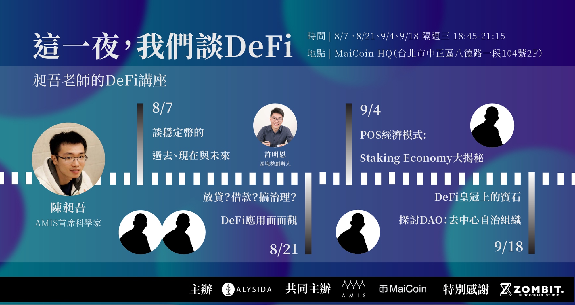 ALYSIDA 鏈社群致力探索各種「鏈」的可能性,特意規劃「這一夜,我們談 DeFi — 昶吾老師的 DeFi 講座」系列活動,以 DeFi 為題、由 AMIS 首席科學家陳昶吾主持四場深度探討,邀請專家們各抒己見。從「穩定幣」開始到「去中心化借貸」等現下大熱的 DeFi 發展,從逐漸成形的「PoS 新共識經濟」(Staking Economy),乃至「去中心化自治組織」(DAO)的最新現況,我們即將在數場活動中全方位點評 DeFi 的潛力與挑戰。