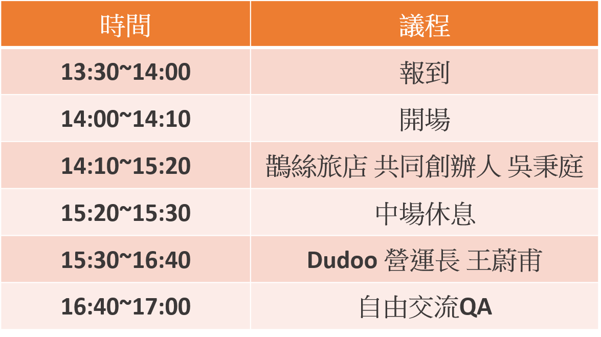 本次活動,邀請到 剛獲得鴻海及王品集團共同投資的 智能POS系統dudoo肚肚營運長 王蔚甫及打造全台第一家無人飯店的鵲絲旅店 共同創辦人吳秉庭 ,前來分享如何善用大數據進行智慧加值、優化營運效率、服務升級,創造新商機,以及實務上的操作案例分享。