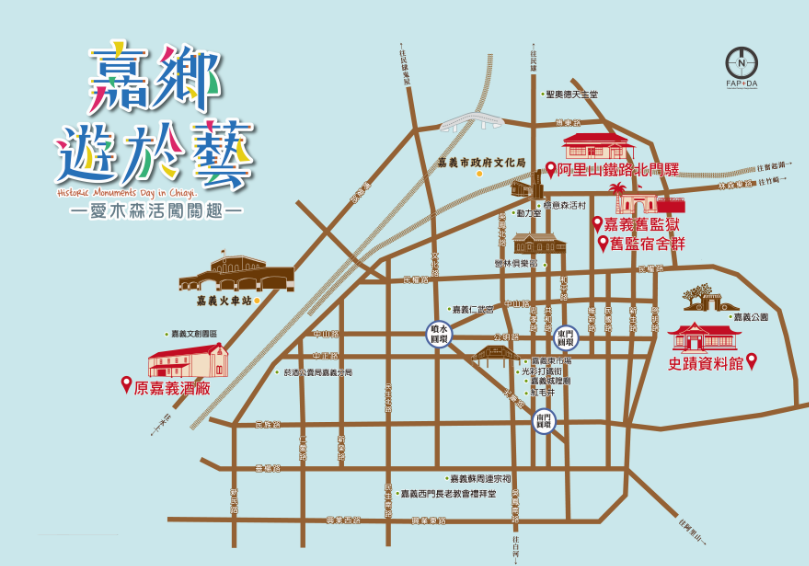 感受歷史的氛圍,來場有趣的古蹟體驗──歷史場域的小巷裡設有系列關卡,藉由指定任務,完成製作裝置藝術的素材,集結眾人成果,拼貼出舊監的新樣貌,一同完成屬於嘉義的裝置藝術──「嘉人印象」!