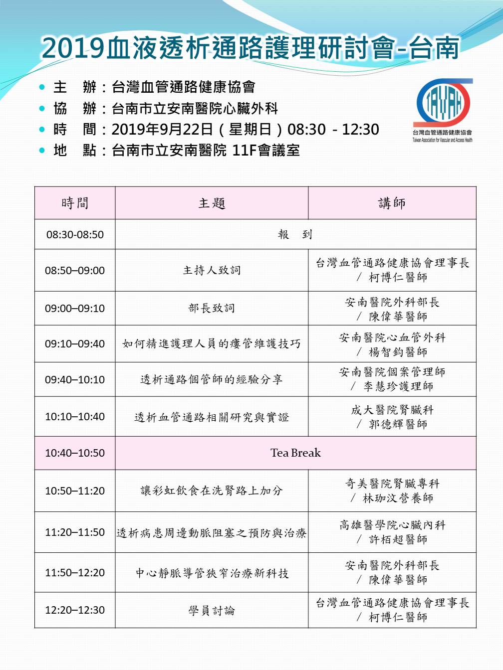 這次我們將順順列車繼續往南行駛,來到了台南,這是由台灣血管通路健康協會所舉辦的第二場血液透析通路護理研討會~我就要你順順的~2019血液透析通路研討會-台南趴 !!! 這次的講師陣容一樣非常堅強,除了本協會在南區優秀的理事 安南醫院外科部長陳偉華部長 為我們帶來【中心靜脈導管狹窄治療新科技】,安南醫院心血管外科亂世俠醫-楊智鈞醫師為我們帶來的課程為【如何精進我們的瘻管維護工作】,這都是在臨床透析室的姊妹們最希望可以得到的新知識!