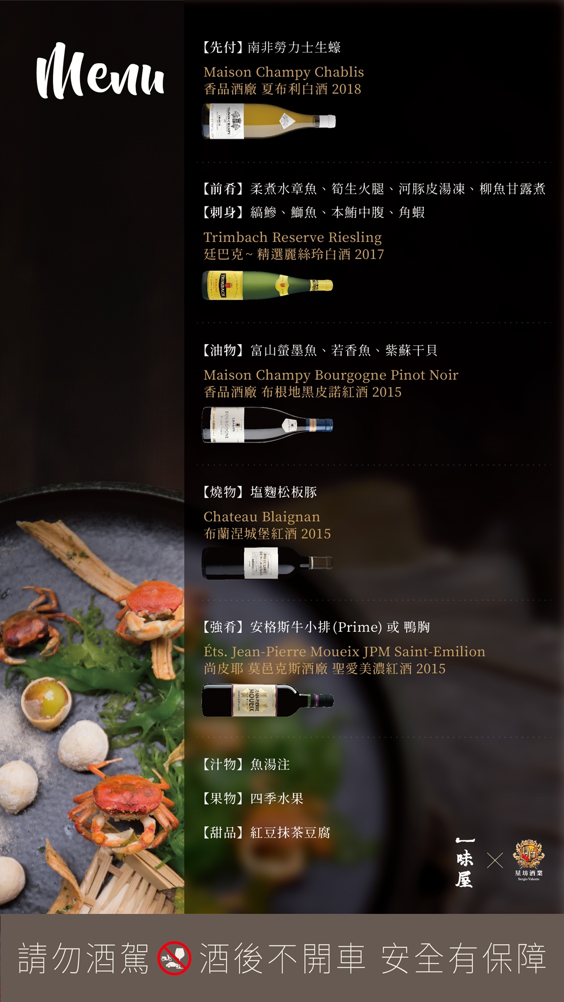 由鬍鬚李錫宗師傅特選日本直送食材,遵循自然工法製作料理,佐餐酒則由星坊酒業精選法國波爾多左右岸、布根地區等經典紅白酒,帶您領略日法餐酒細緻搭配!