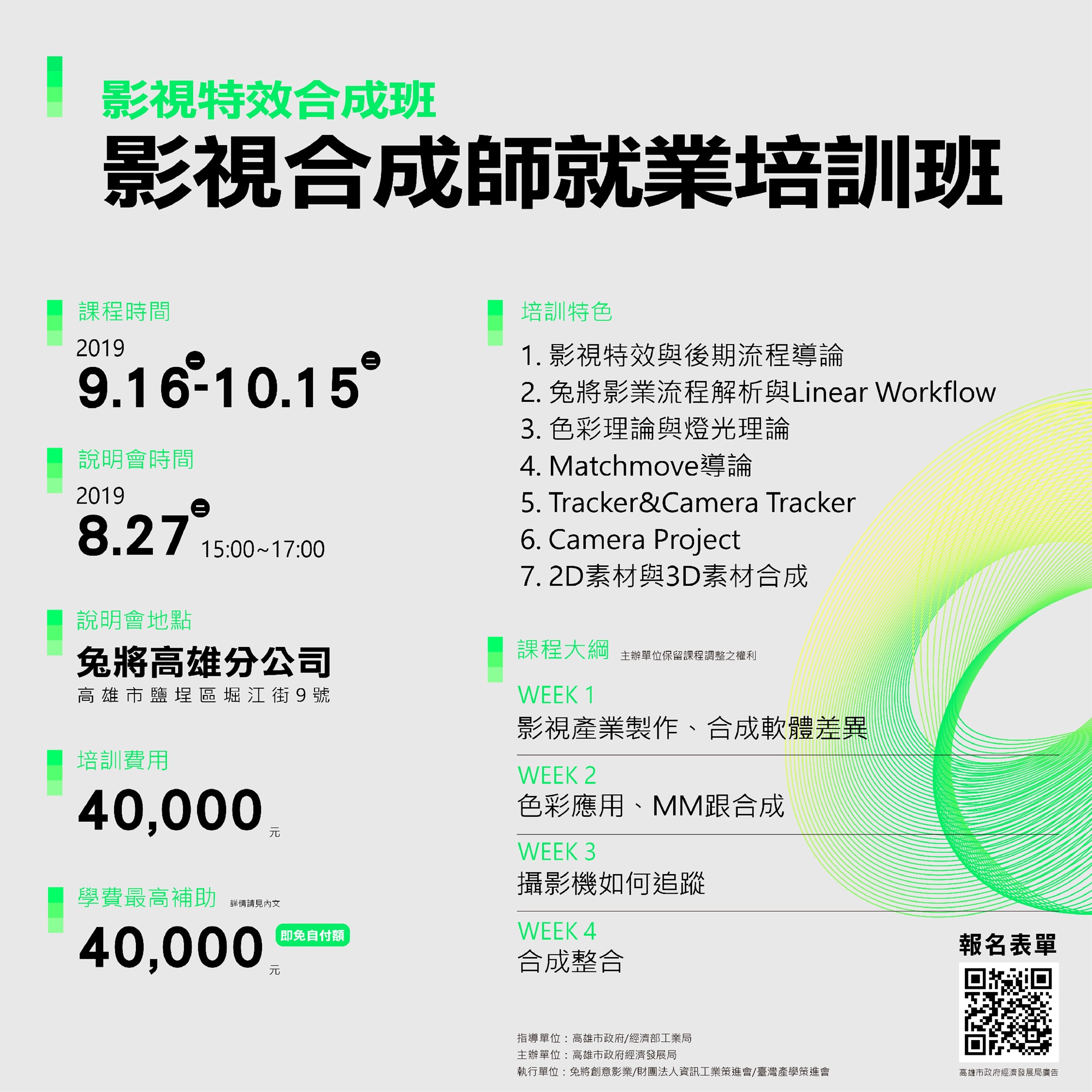 1) 凡參加此影視合成師就業培訓班,提供完整報名資訊(個人履歷及作品集),經臺灣產學策進會審核符合加入培訓班的資格者,可獲由高雄市政府經濟發展局補助30,000元 (即自付保證金10,000元)