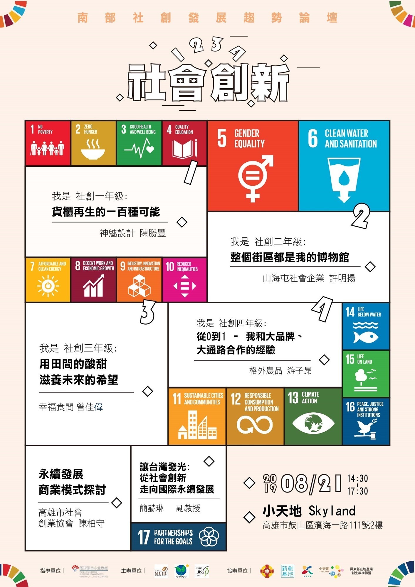 本次論壇我們分別邀請從1歲到4歲不同年代成立的南台灣社會企業代表,包括格外農品(2015)、幸福食間(2016)、山海屯社會企業(2017)、神魅設計(2018),分享當時成立的背景,近幾年的發展現況,特別是如何推動理念並修正自己的商業模式,以及創業過程中所遇到的問題,並邀請甫自聯合國大學進修回來的簡赫琳教授擔任主持人,從國際觀點談社會企業如何結合聯合國永續發展目標營運並茁壯成長。