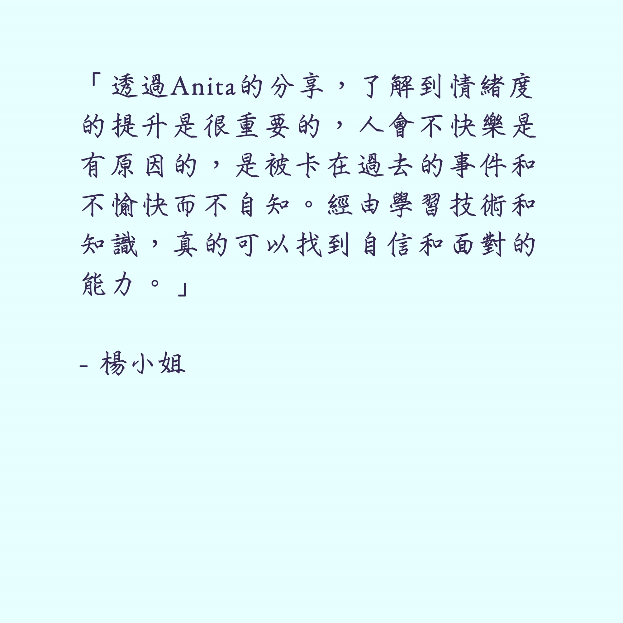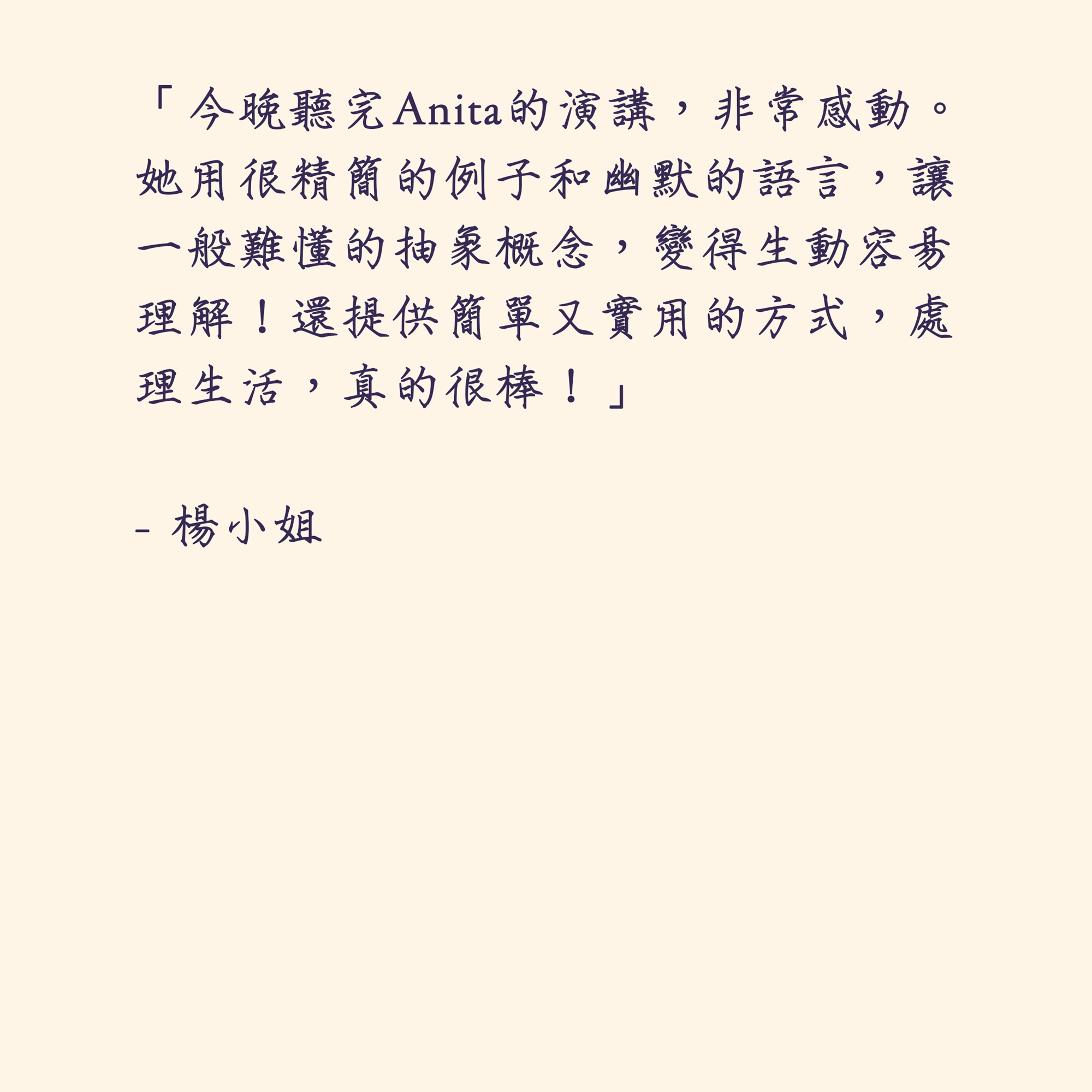 ➲ Anita企業教練,累積一對一諮商輔導超過數千小時,熱衷於知識培訓、人才養成、教練人們輕鬆運用所學、享受學習的樂趣,並進一步優化生活、工作與企業管理,已經協助超過千人,完成目標實現夢想。