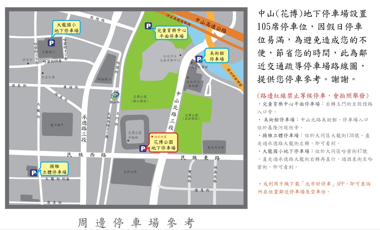 ● 兒育中心停車場:位於玉門敦煌路口(兒育出入口)北側。
