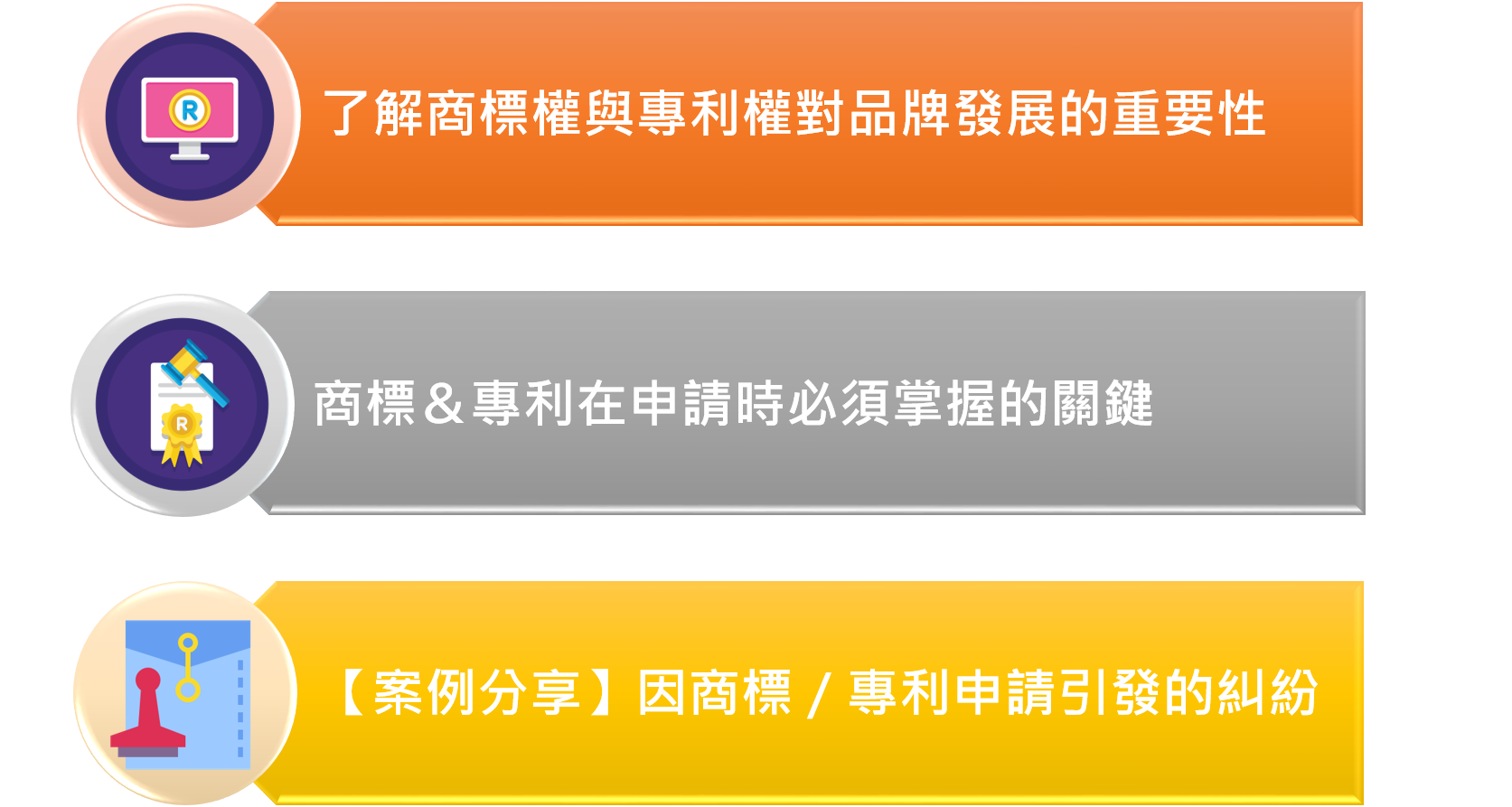 本次講座邀請到「瀛睿律師事務所高雄所」的張桐嘉主持律師,講解商標&專利申請必備知識、商標權、專利權差異與重點及這兩者對於品牌有何保護性。