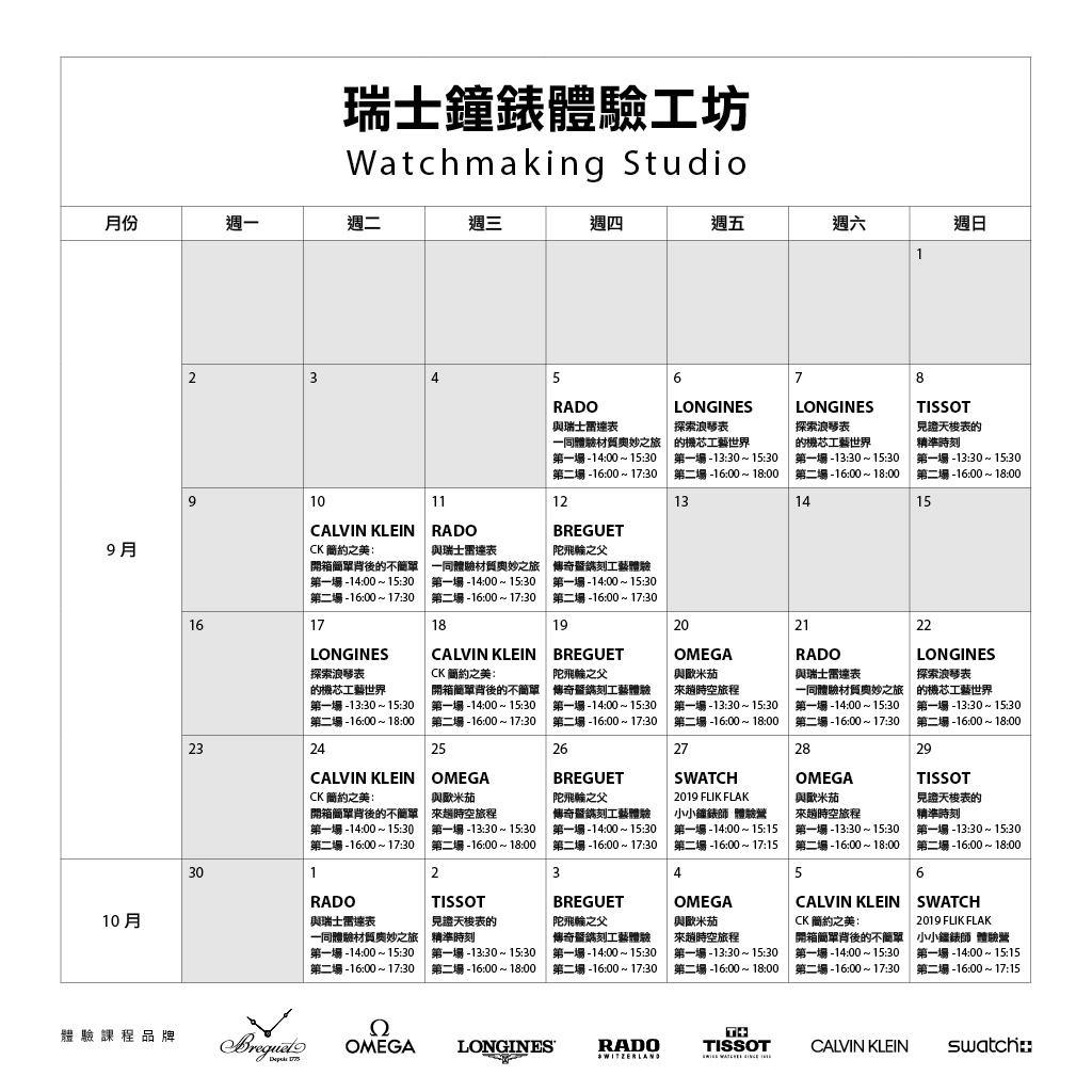 全球最大鐘錶集團瑞士商斯沃琪瑞表Swatch Group首度將瑞士總部設計概念與專業設備,移師台北101,提供旗下Breguet, Omega, Longines, Rado, Tissot, Calvin Klein, Swatch等瑞士鐘錶品牌製錶體驗課程,包含機芯、錶殼、鍊帶、面盤、細部零件組裝,近距離體驗製錶的精湛工藝。