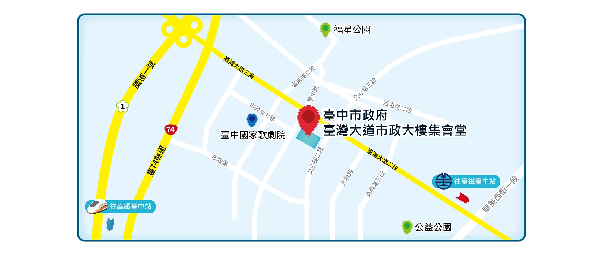 下【市政路交流道】後→右轉市政路→左轉惠中路→行駛至惠中路與臺灣大道3段交叉口→臺中新市政大樓