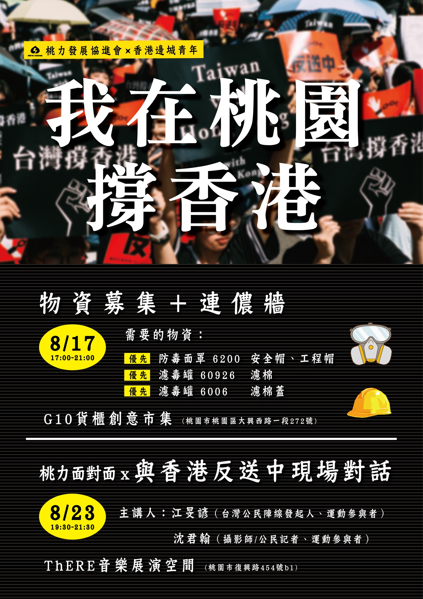 第一場活動,是8月17日在桃園G10貨櫃創意市集的「物資募集&連儂牆」活動。現場會發放便利貼供大家填寫。希望收集的物資包括:半罩式安全帽以及工程帽、防毒面罩 6200、濾毒罐 60926、濾毒罐 6006、濾棉蓋 501 / 502、濾棉 5N11 / 2901。