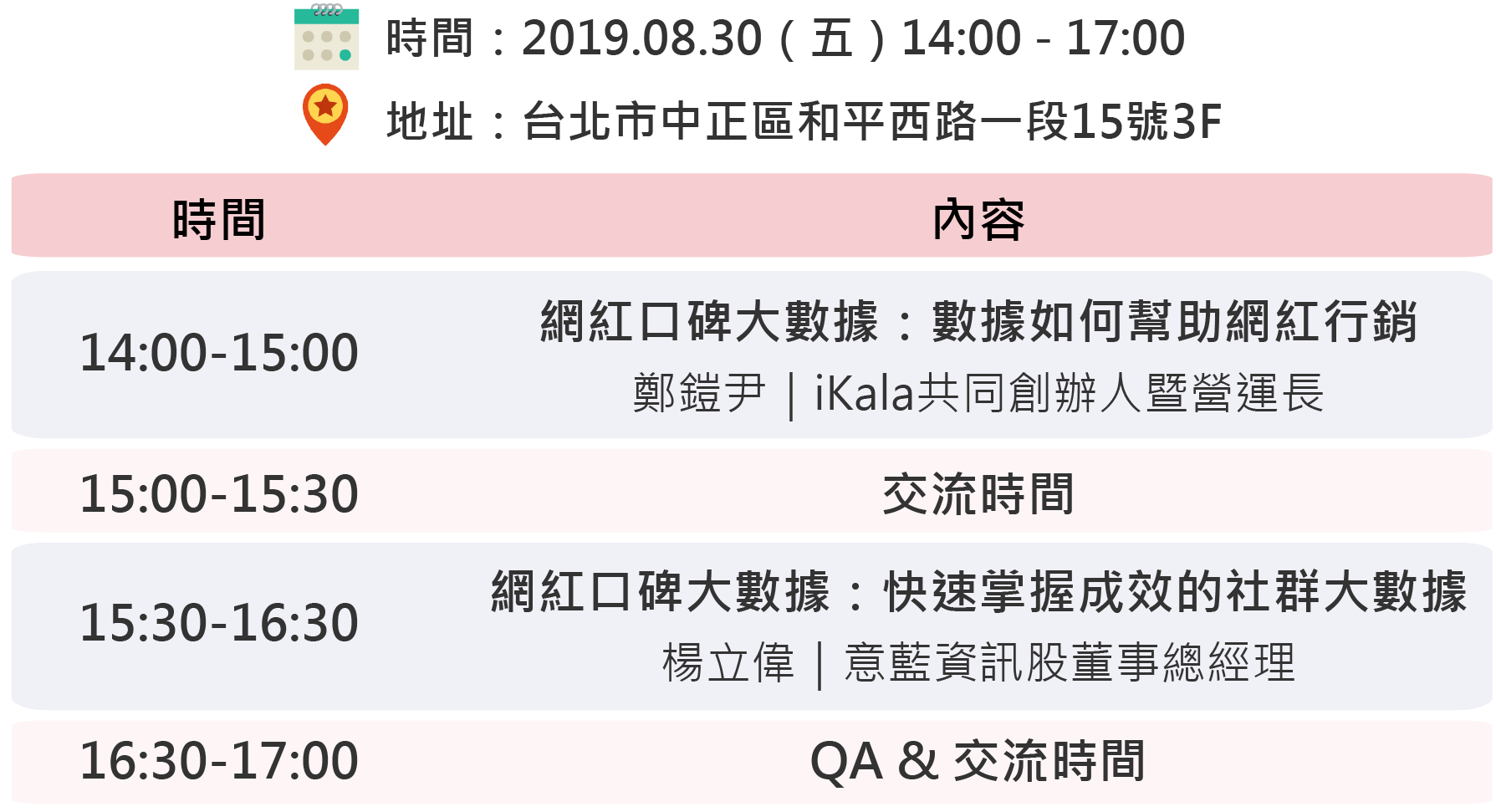 由 iKala共同創辦人 鄭鎧尹Keynes 與 意藍資訊董事總經理 楊立偉Willie ,兩位大數據領域重量級講師,輪番上陣公開獨家網紅數據報告、趨勢洞察,以及分享多個網紅實務案例,更可以現場與講師互動問答,機會難得。