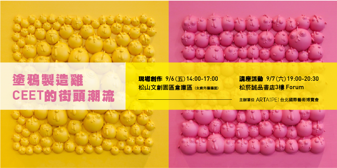 Ceet長期以「雞」為主題,以街頭為畫布,潑灑幽默逗趣的色彩,引發全球熱烈響應,更曾與國際知名品牌Adidas、Airdus,Ecko與Loewe攜手合作。9月6日至7日將舉辦「塗鴉製造雞 - CEET現場創作與分享座談會,為歷久彌新的 ART TAIPEI 起跑熱身。
