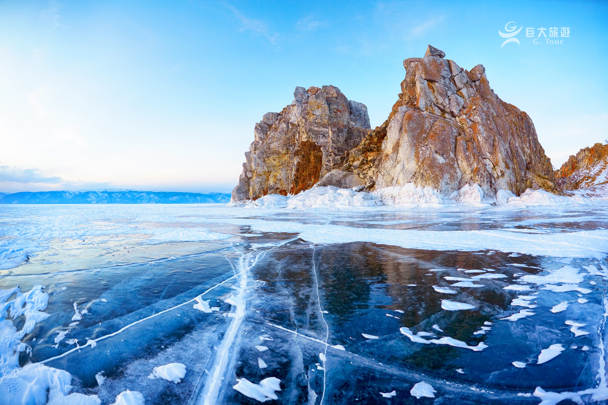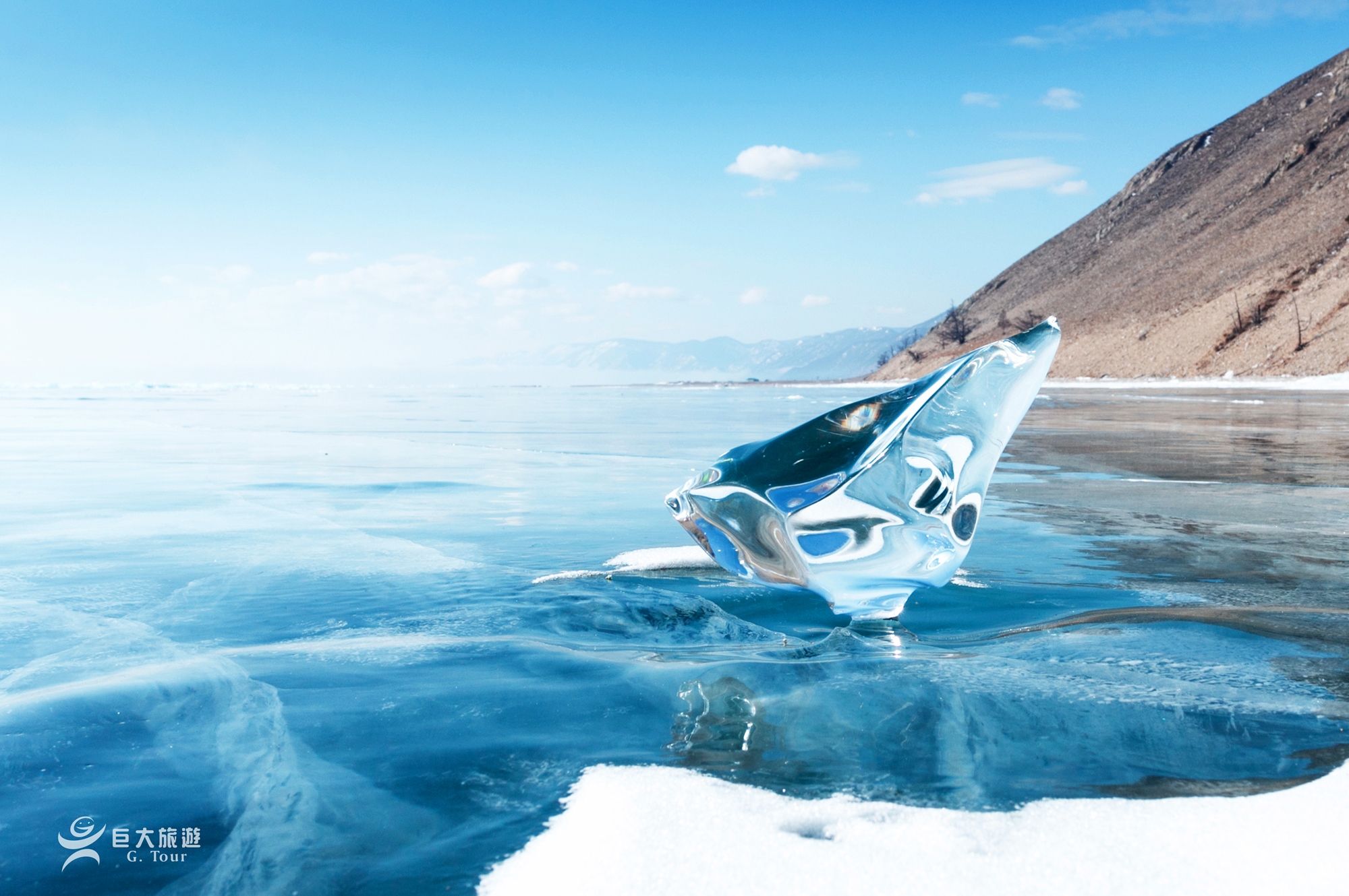 冰封期的貝加爾湖,猶如上帝忘記帶走的翡翠珠寶,陽光照耀下,幻化成絕美的藍冰,是攝影好手們爭先目睹的奇景。