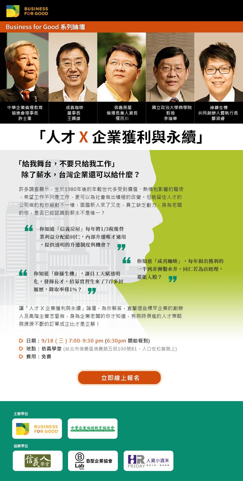 B型企業協會與多方夥伴聯合推出一個為期三年的 Business for Good 計畫,這是一個接軌聯合國永續發展目標(Sustainable Development Goals,以下簡稱SDGs)的計畫--透過商業模式之改造,提升台灣中小企業創新影響力,同時培育青年實力,將由企業、各領域專家與年輕世代三方共創,一起掌握永續商機的培力計畫。提供參與者國際視野、系統思考、商業模式競爭力、創新與創業力,在變動時代中,提前佈局永續價值鏈,將可能的生存危機化為轉機、成就影響力的永續商機。