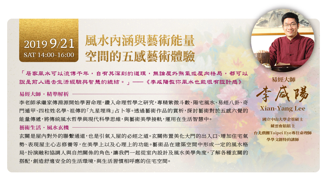 展覽期間結合講座活動,於2019年9月21日(六)下午2:00舉辦「風水內涵與藝術能量-空間的五感藝術體驗」講座,從東方風水古老學問之中,分享現代科學思維及藝術生活美學,是一系統性協調人為條件與環境之間的概念,期與各位愛藝好友共享嬉月游藝、說書聆樂、賞畫酩茶的美好時光。